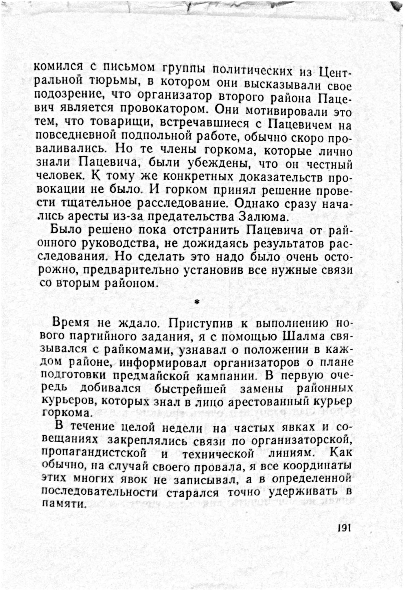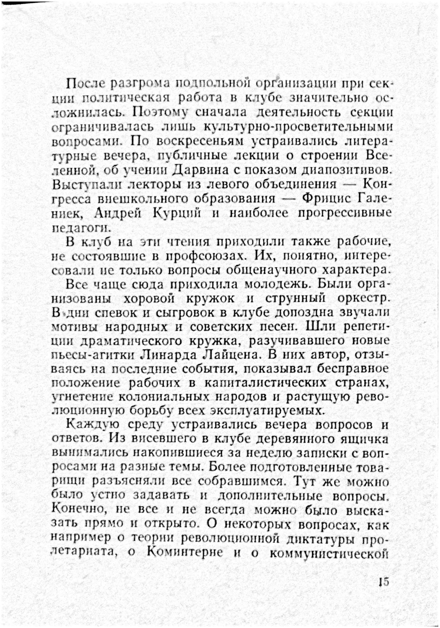 | s001_p009 | girsh rapoport 1 of x.pdf | 9 | preview | ocr | local | not_flagged | = После разгрома подпольной организации при сек: ции политическая работа в клубе значительно ос- ложнилась. Поэтому сначала деятельность секции ограничивалась лишь культурно-просветительными вопросами. По воскресеньям у |