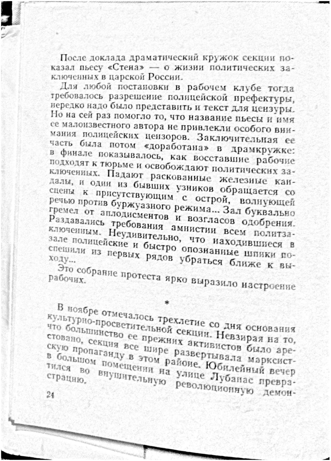 | s001_p018 | girsh rapoport 1 of x.pdf | 18 | preview | ocr | local | not_flagged | => а и оный —=-- чи „| = /' После доклада драматический кружок секции по- казал пьесу «Стена» — © жизин политических за- ключенных в царской России. Для любой постановки в рабочем клубе тогда требовалось разрешение п |