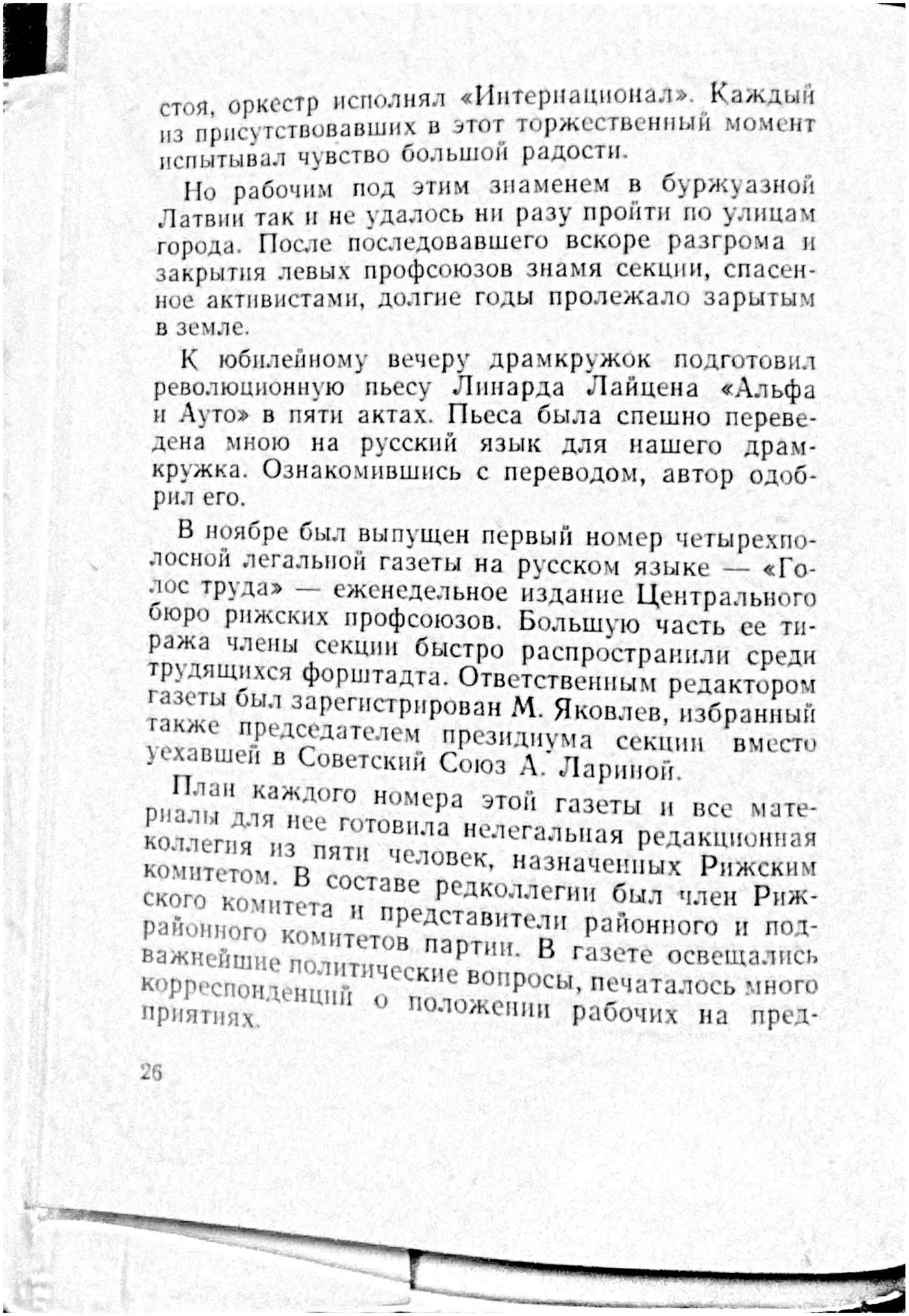 | s001_p020 | girsh rapoport 1 of x.pdf | 20 | preview | ocr | local | not_flagged | : Я стоя, оркестр исполнял «Интернационал». Каждый из присутствовавших в этот торжественный момент испытывал чувство большой радости. Но рабочим под этим знаменем в буржуазной Латвии так и не удалось ни разу пройти по у |