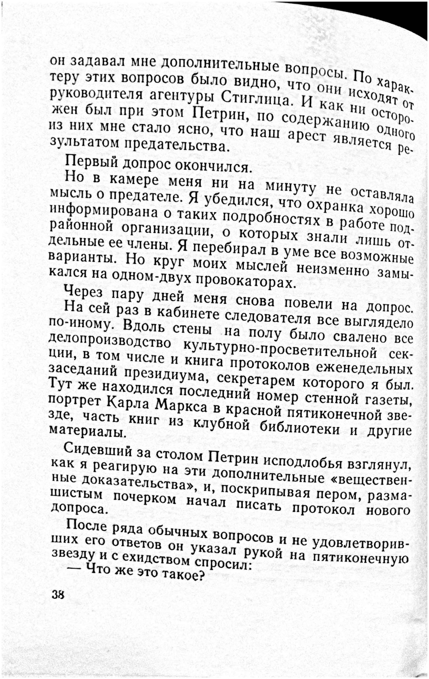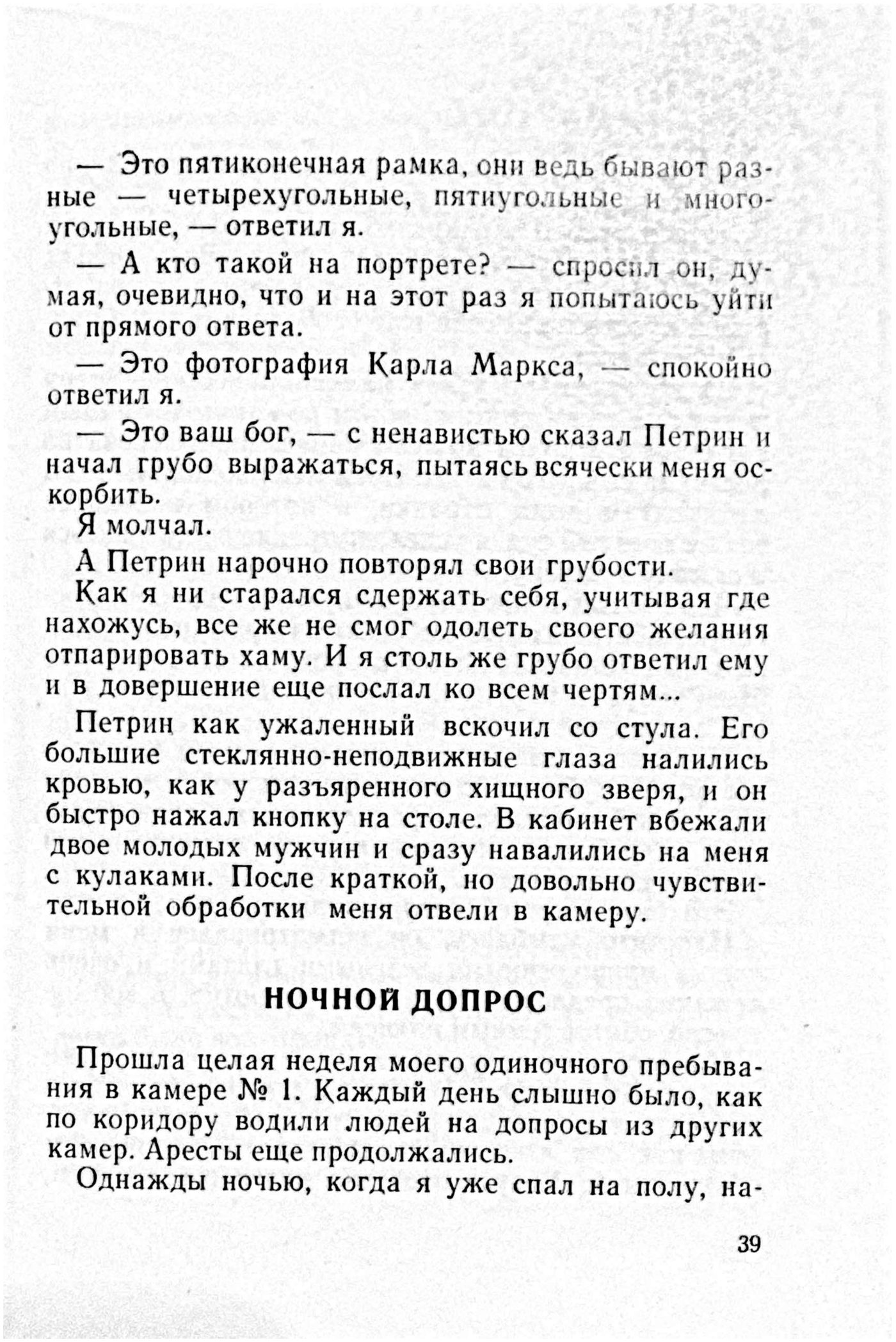 | s002_p013 | girsh 2 of x.pdf | 13 | preview | ocr | local | not_flagged | 1 Так окончился неожиданный для меня Ночной | допрос. Н Но мопровского листка по сбору денег для по. | мощи политзаключенным, найденного при аресте) у Качанова, и одного экземпляра нелегальной бро- — шюры, изъятой у ме |