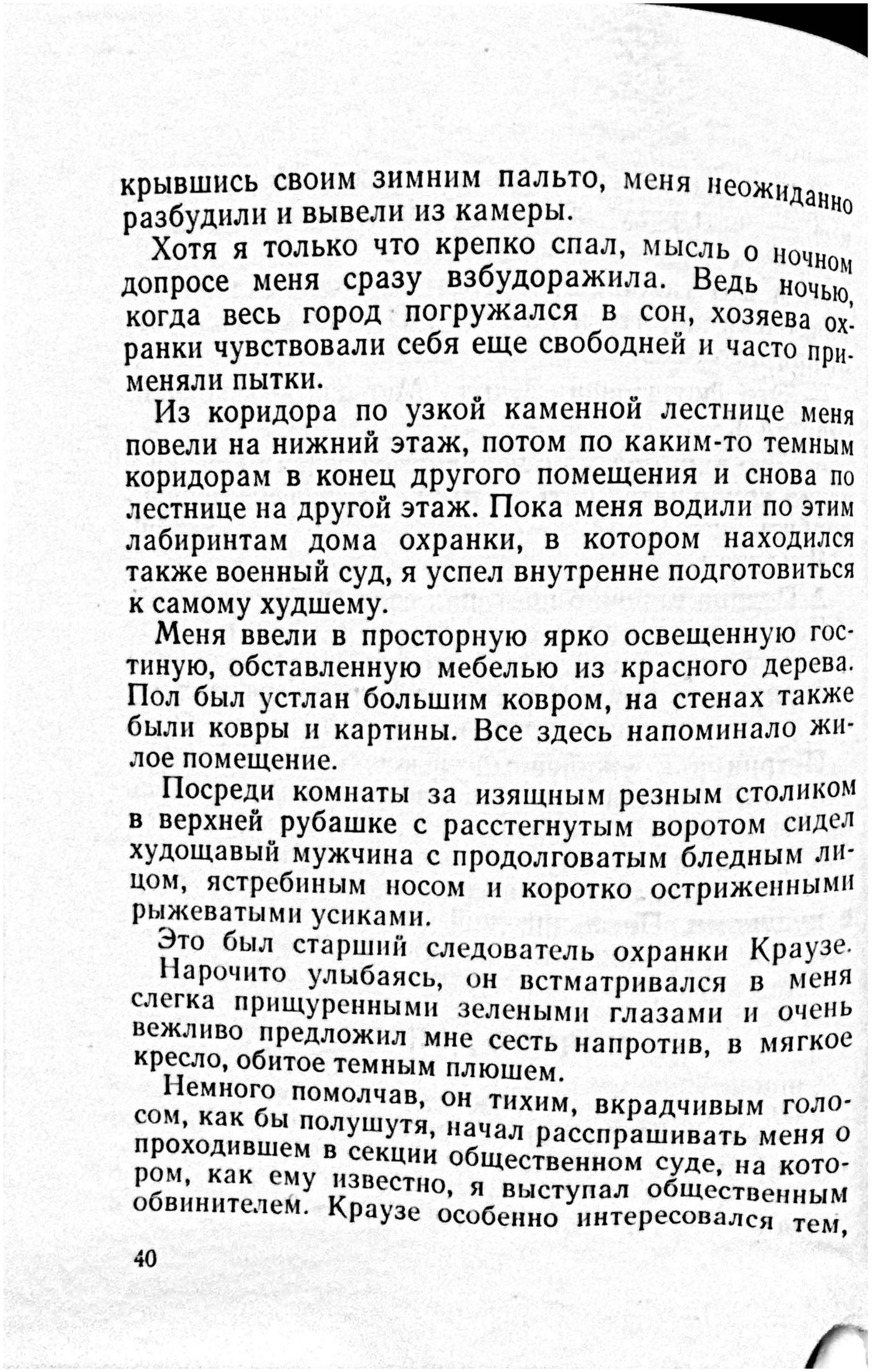 | s009_p043 | girsh 9 of x.pdf | 43 | preview | ocr | local | not_flagged | гулку, и что я могу прийти, так как дома все в по- рядке. 1 Но все же Краузе вместе со спутником заходили ] во двор нашего дома, — вероятно, они были в ка- Е кой-то другой квартире. . Мы обратили также внимание на то, чт |