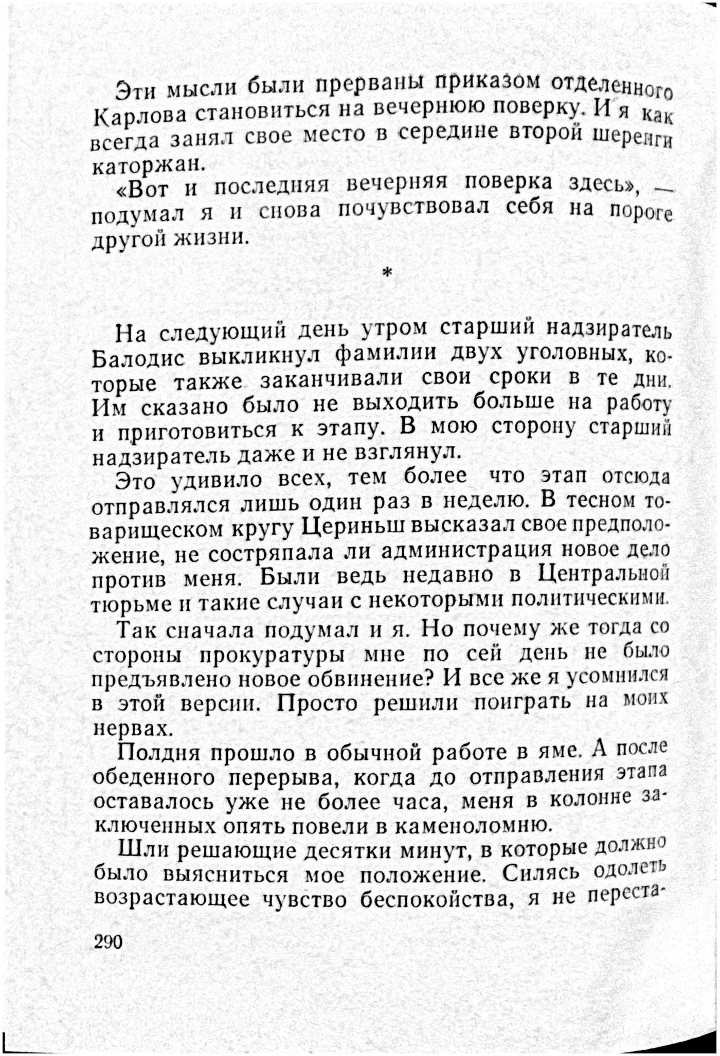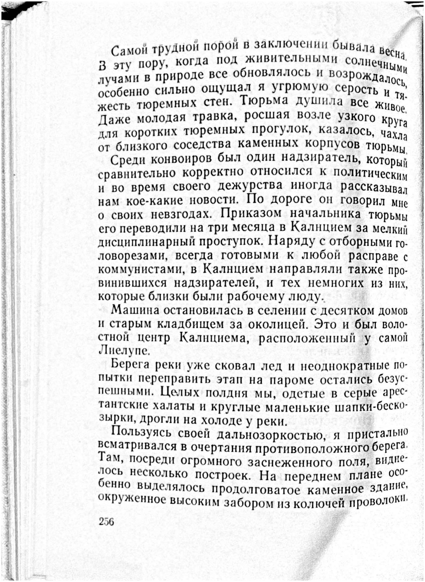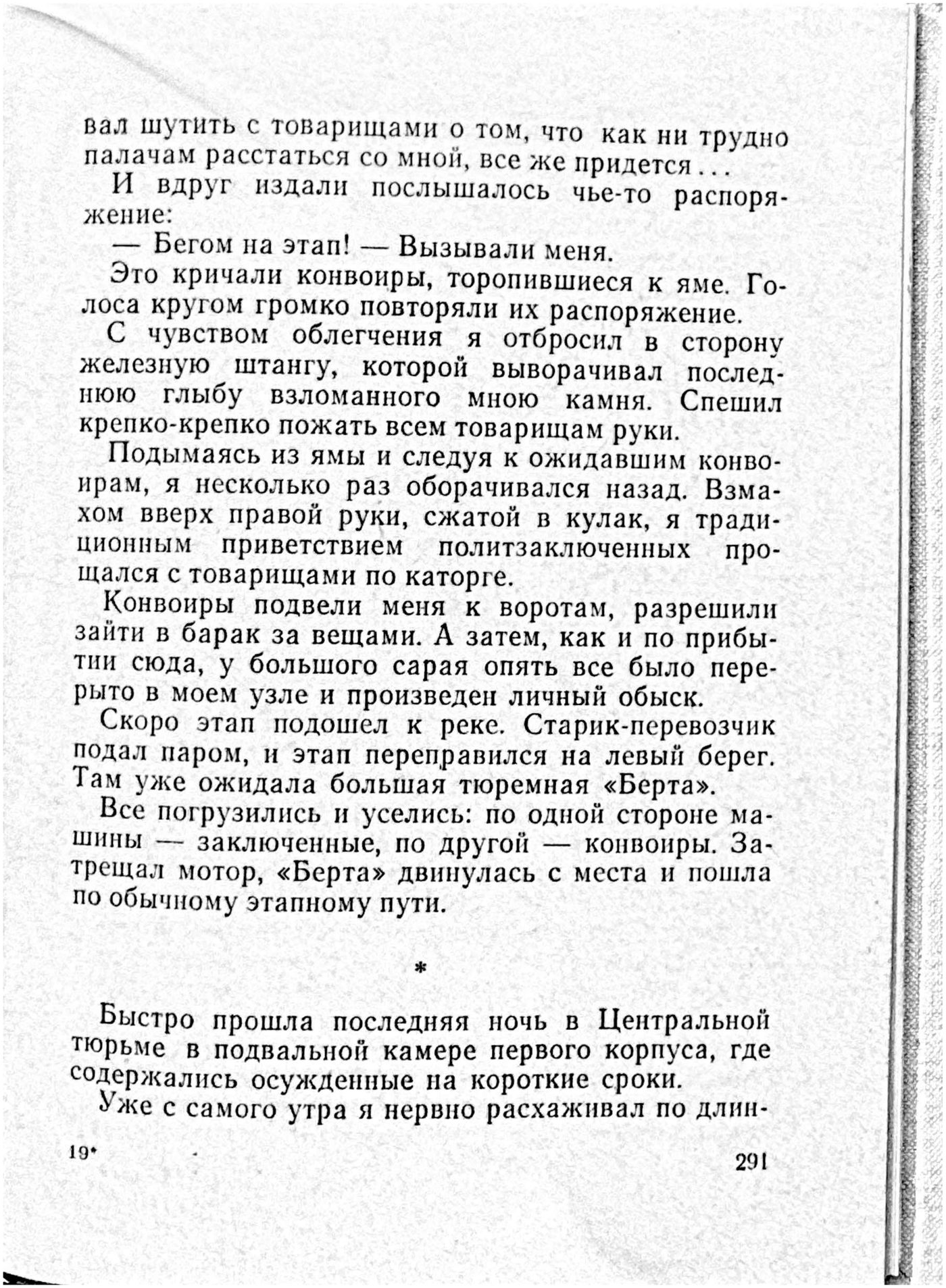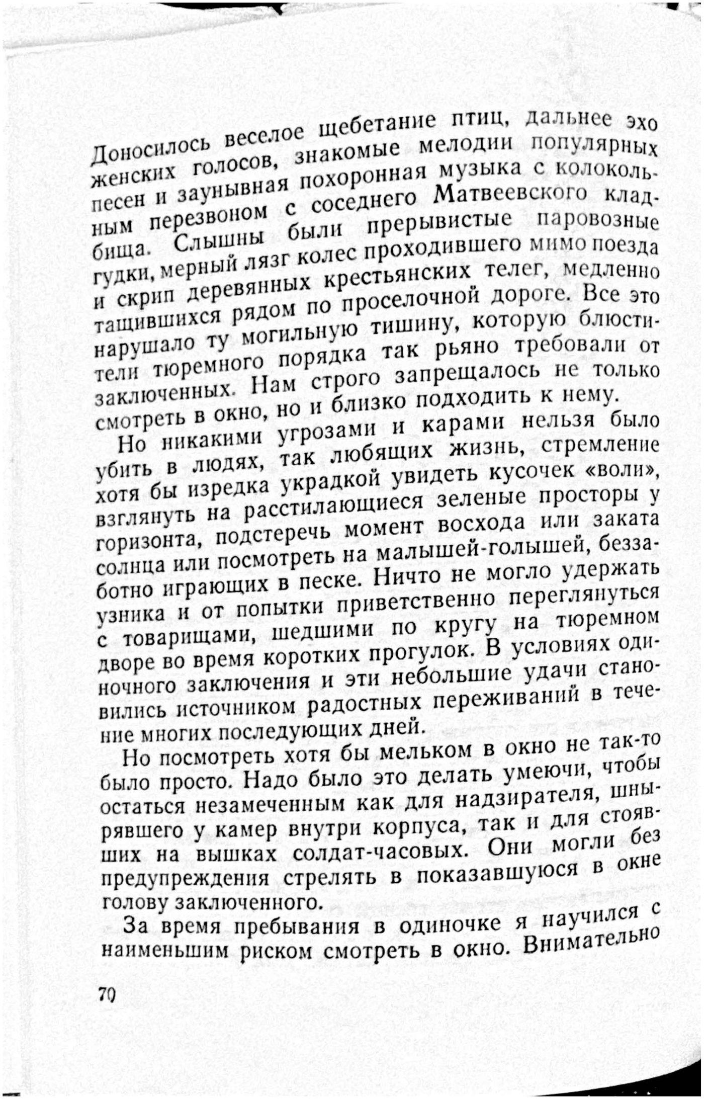 | s008_p032 | girsh 8 of x.pdf | 32 | preview | ocr | local | not_flagged | | Люди почти не говорили друг с другом. Каждый был занят своими мыслями. | Нас переводили из Центральной тюрьмы, в оди- ночных корпусах которой пришлось многое испытать и пережить. Но нас увозили из города, где мы хоть |