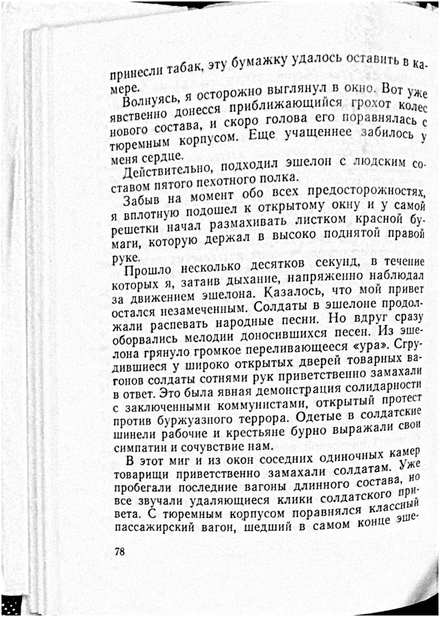 | s003_p027 | girsh 3 of x.pdf | 27 | preview | ocr | local | not_flagged | —» щг\ч принесли табак, эту бумажку удалось оставить в ка. мер ‚но выглянул в ок Волнуясь, Я осторож! у Е но. Вот Уже явственно донесся приближающийся грохот колес нового состава, И скоро голова его поравнялась ‹ тюремн |
