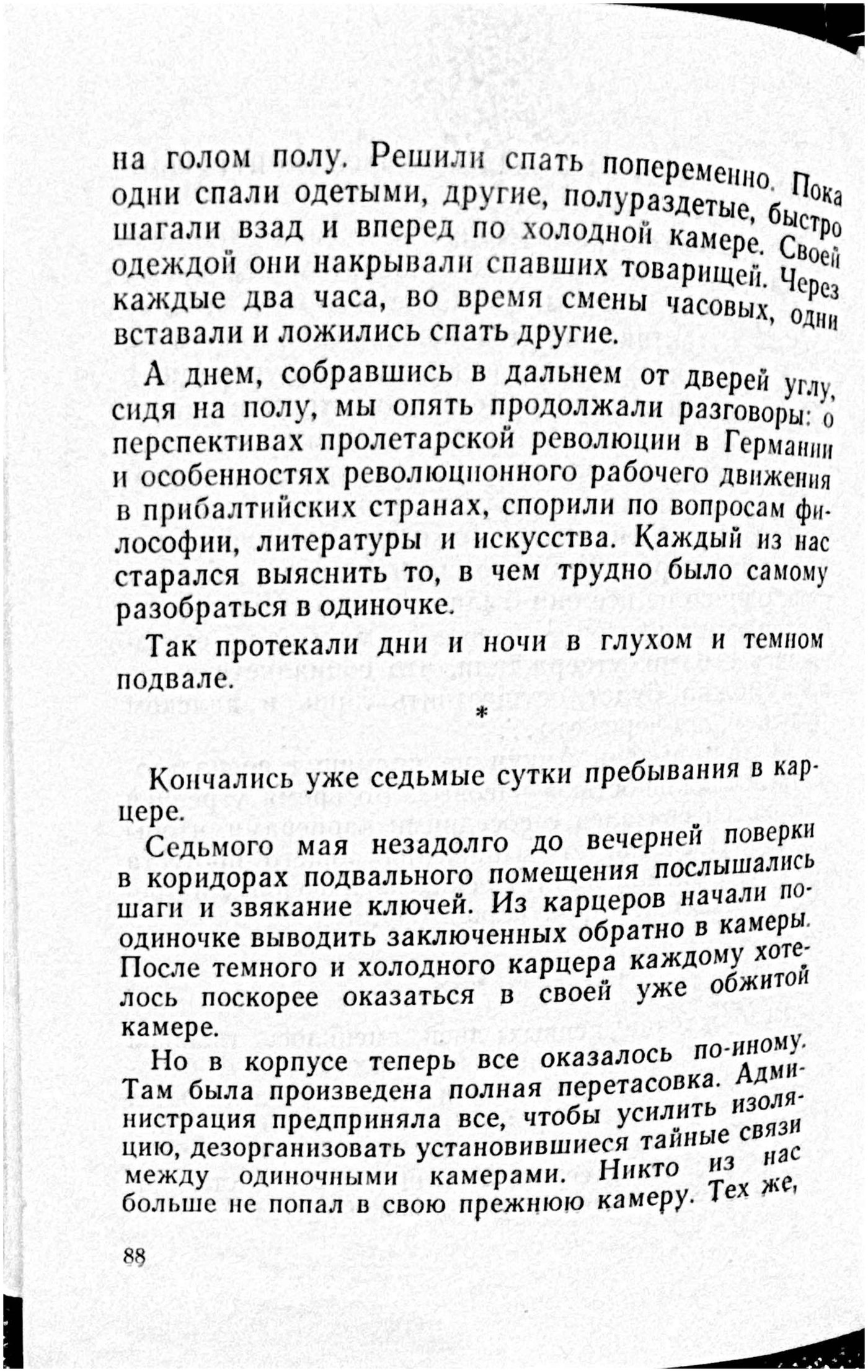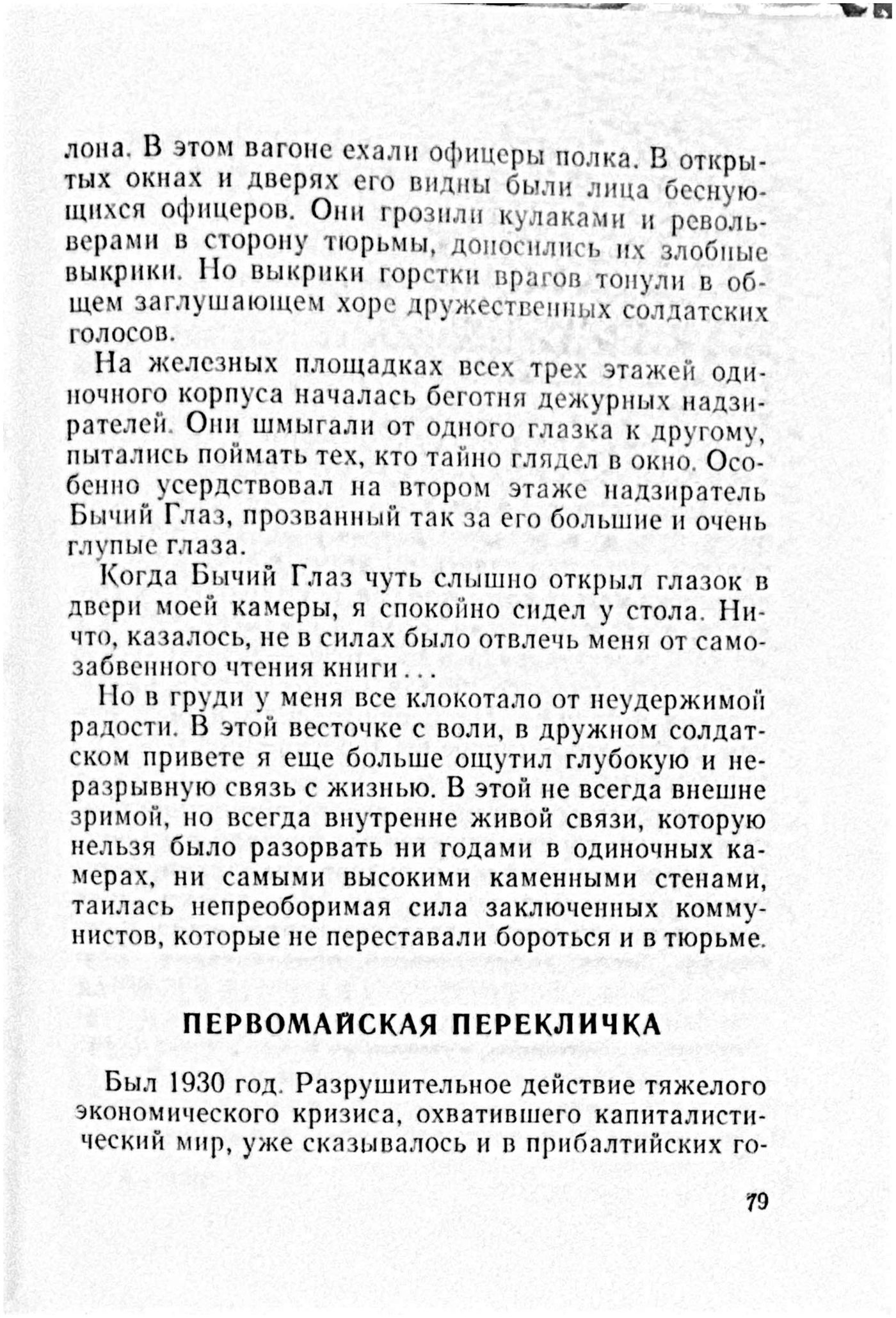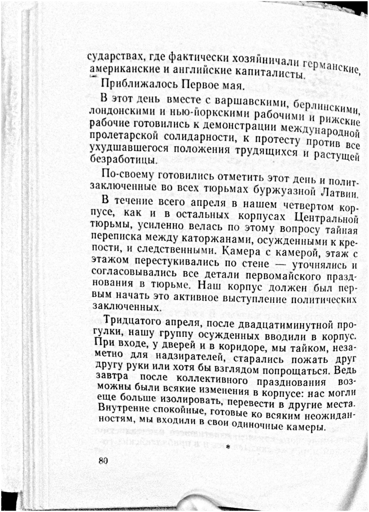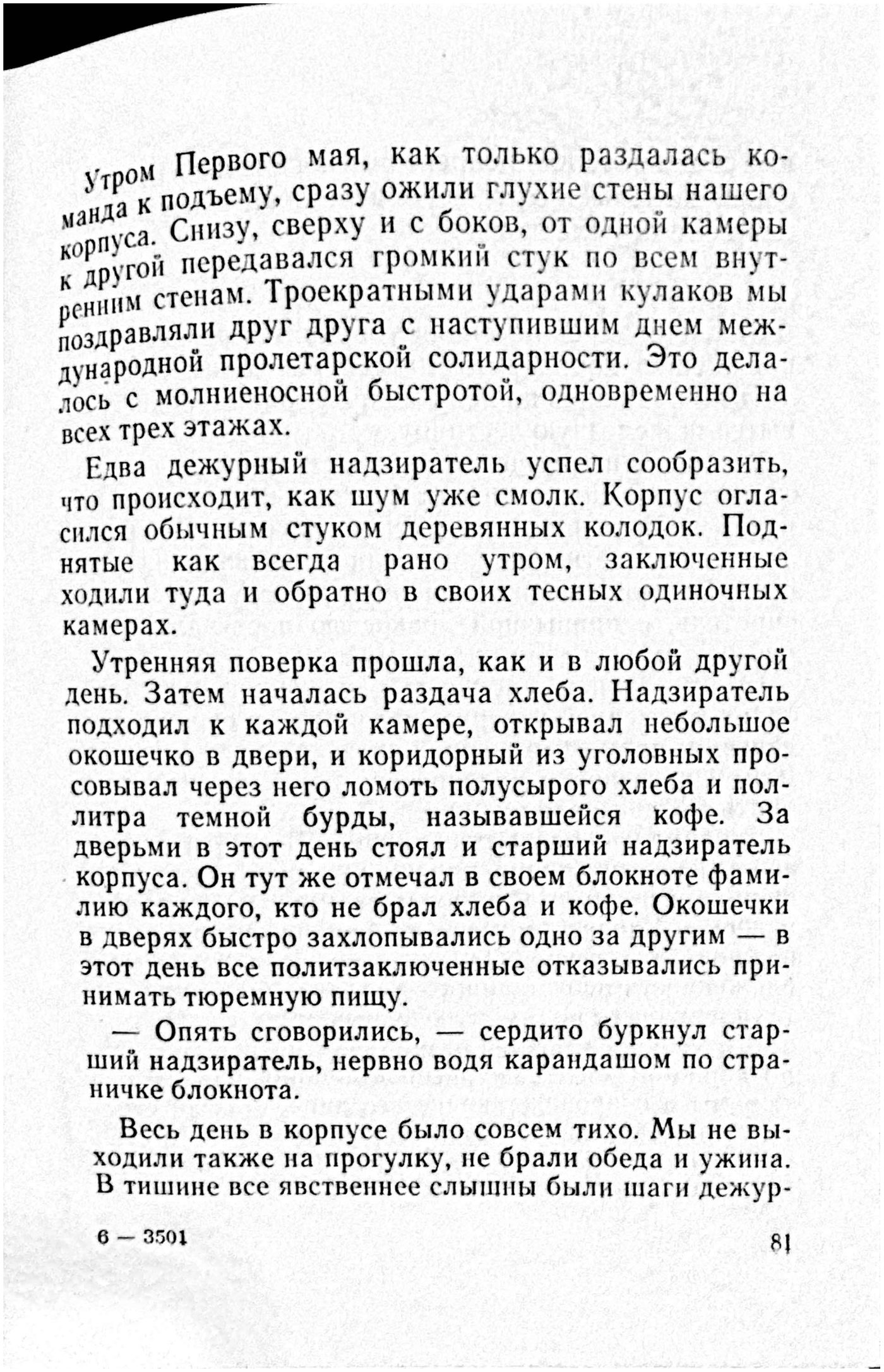 | s003_p030 | girsh 3 of x.pdf | 30 | preview | ocr | local | not_flagged | утром Первого мая, как только раздалась ко- нда К подъему, сразу ожили глухие стены нашего х. пуса. Снизу, сверху и с боков, от одной камеры кор той передавался громкий стук по всем внут- к нним стенам. Троекратными уда |
