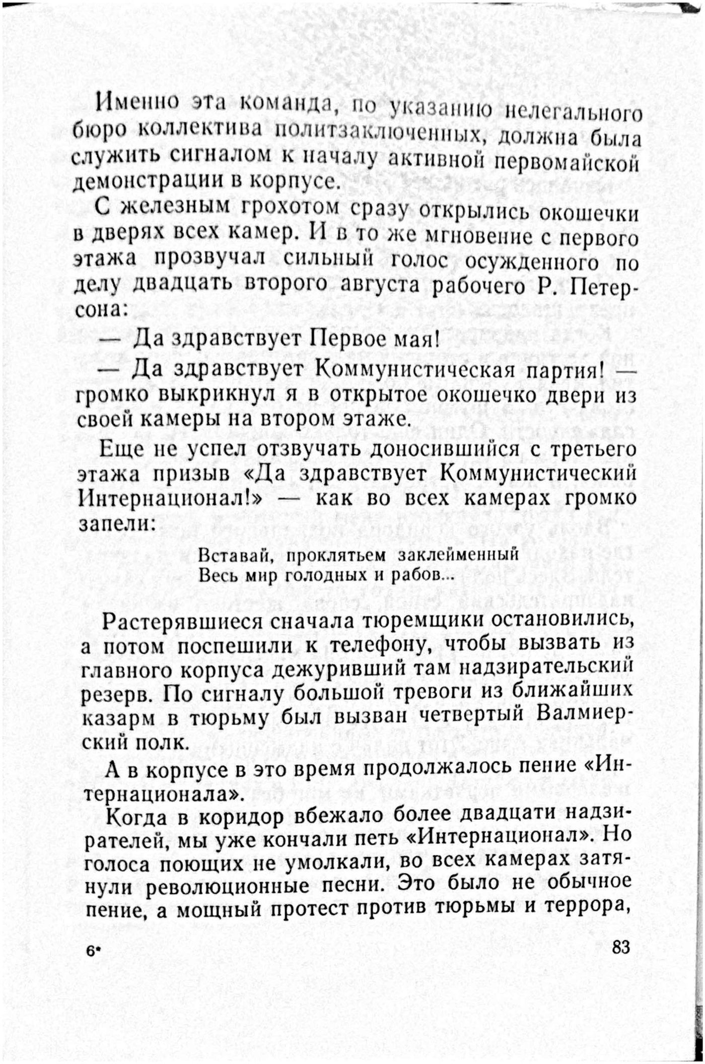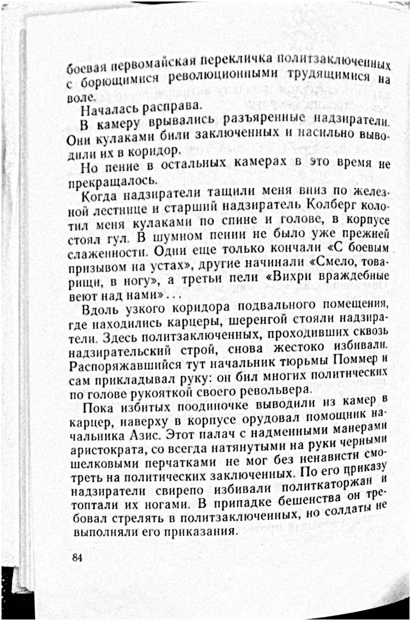 | s004_p003 | girsh 4 of x.pdf | 3 | preview | ocr | local | not_flagged | боевая первомайская перекличка политзаключенны с борющимися революционными трудящимися ж воле. Началась расправа. В камеру врывались разъяренные надзиратели Онн кулаками били заключенных и насильно выво. | дили их в Ко |