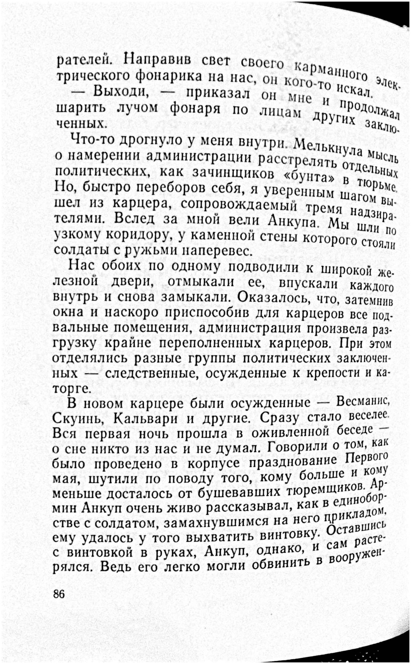 | s008_p036 | girsh 8 of x.pdf | 36 | preview | ocr | local | not_flagged | : одиночной камере в Центральной тюрьме. В Калн- цием его отправили уже несколько месяцев тому назад. Не утерпев, я поспешил спросить Багата, ве- рен ли распространившийся в тюрьме слух, что здесь против него состряпано |