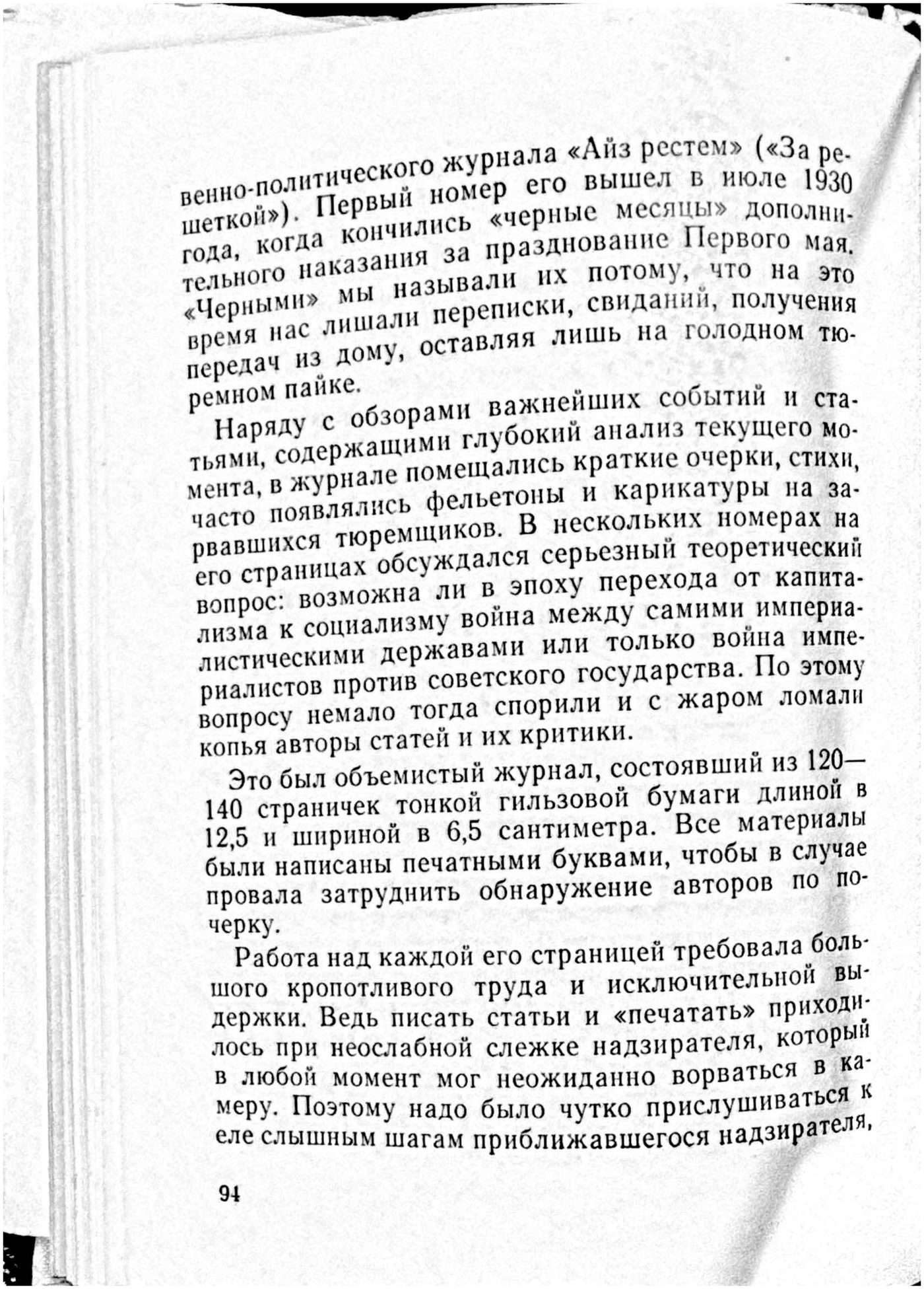 | s004_p013 | girsh 4 of x.pdf | 13 | preview | ocr | local | not_flagged | - —-_- | по М % {/ й олитического журнала «Айз рестем» («За ре. венно, Первый номер его вышел в июле 1930 ет когда кончились НЯ аа дополни- тельного наказания за празд! И ервого мая, «Черными? мы называли Их д А на эт |