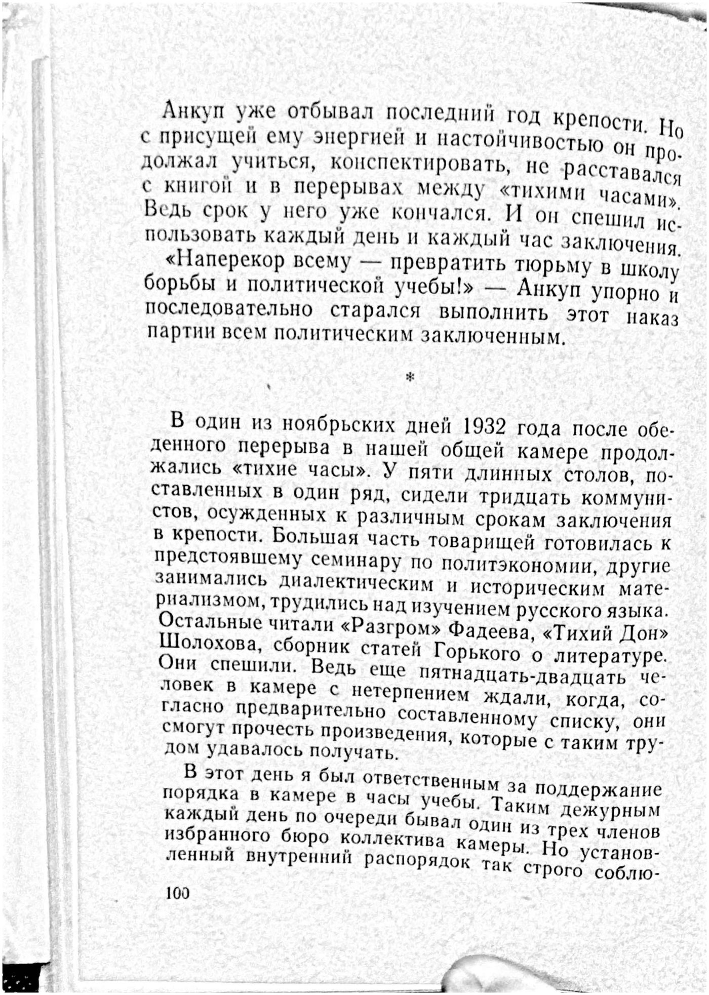 | s004_p019 | girsh 4 of x.pdf | 19 | preview | ocr | local | not_flagged | АЗ Анкуп уже отбывал последний год крепости, Н с присущей ему энергией и настойчивостью ОН о должал учиться, конспектировать, нс Расставался с книгои и в перерывах между «тихими часами» Ведь срок у него уже кончался. И о |