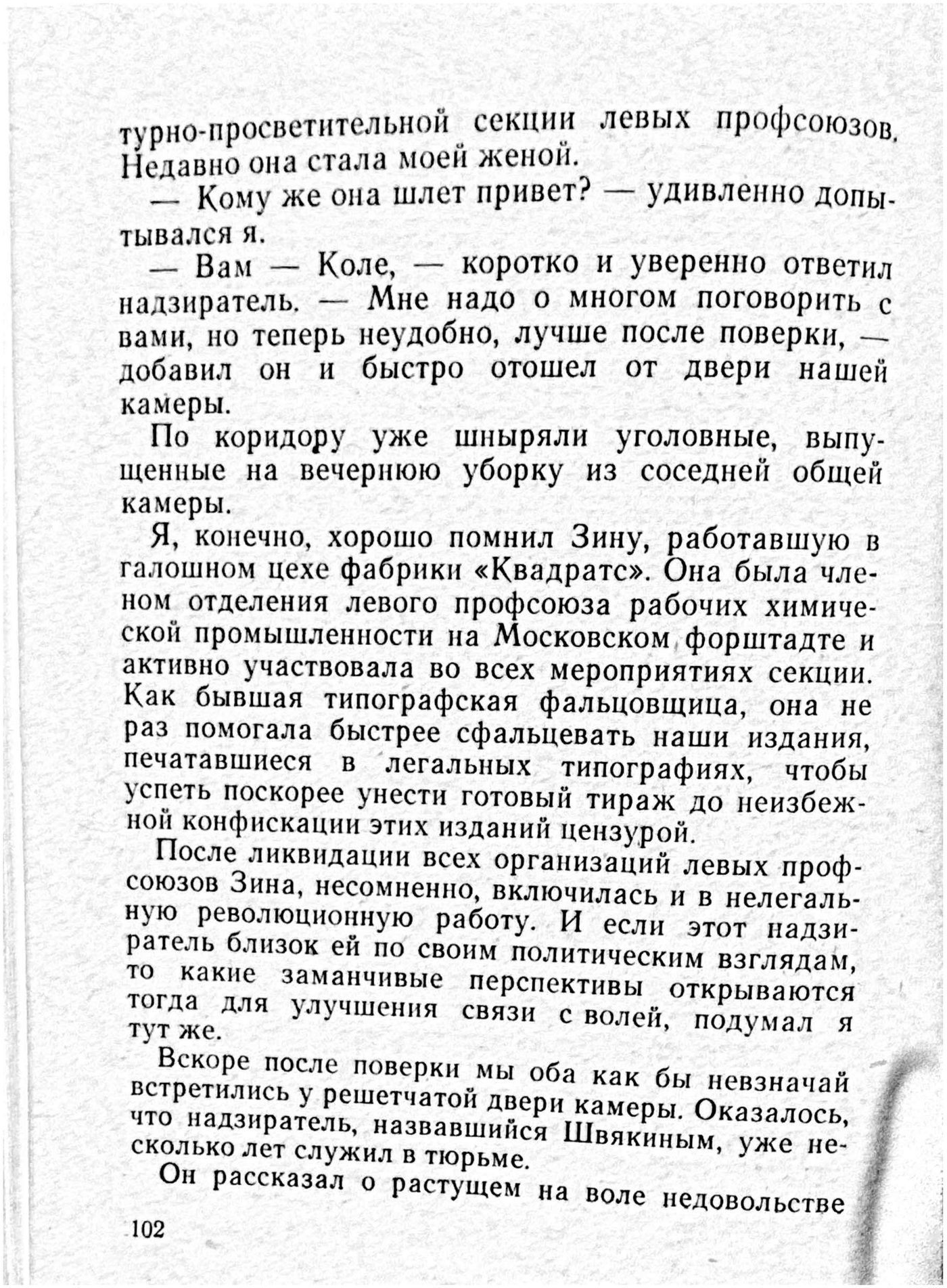 | s004_p021 | girsh 4 of x.pdf | 21 | preview | ocr | local | not_flagged | турно-просветительной секции левых профсоюзов, Недавно она стала моен женой — Кому же она шлет привет: — удивленно допы- тывался я, — Вам — Коле, — коротко и уверенно ответил надзиратель. — Мне надо о многом поговорить |
