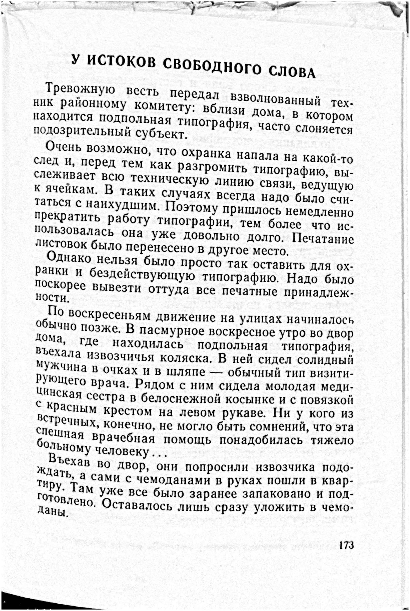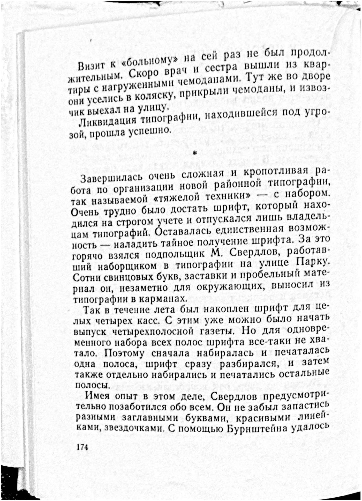 | s010_p006 | girsh 10 of x.pdf | 6 | preview | ocr | local | not_flagged | щиков и сам включил мотор печатной машины. Вме- сте с тнпографскими рабочими он быстро напечатал листовки и на ожидавшей на улице легковой машине увез их на нелегальный пункт для дальнейшего рас- пределения. # Тревожны |