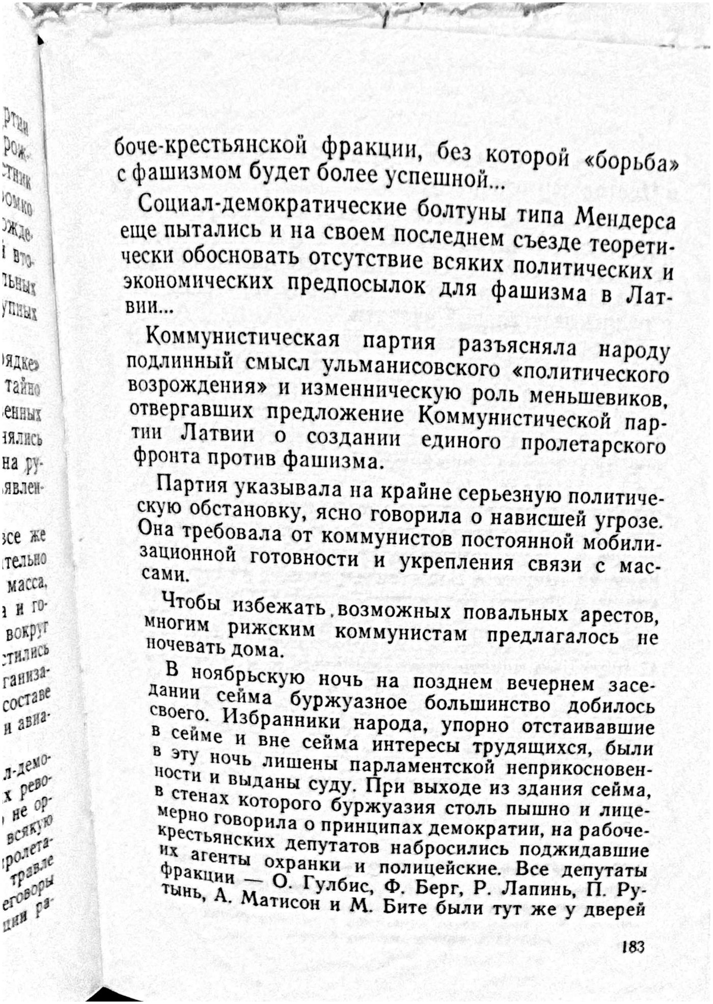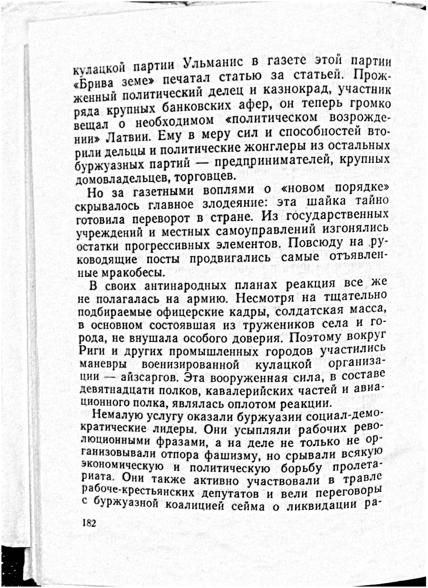 | s010_p011 | girsh 10 of x.pdf | 11 | preview | ocr | local | not_flagged | < организатор фашистского переворота в 1934 году, еще являлся президентом государства и только на днях призывал по радио всех своих ставленников «оставаться на своих местах». Под руководством Коммунистической партии Лат |
