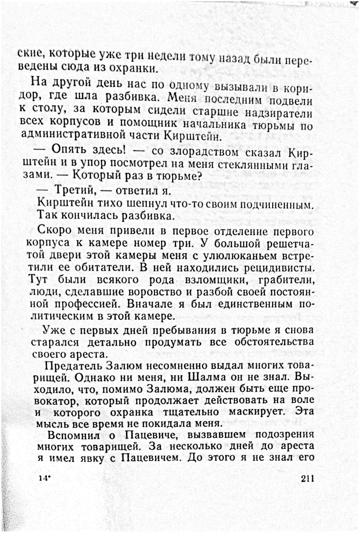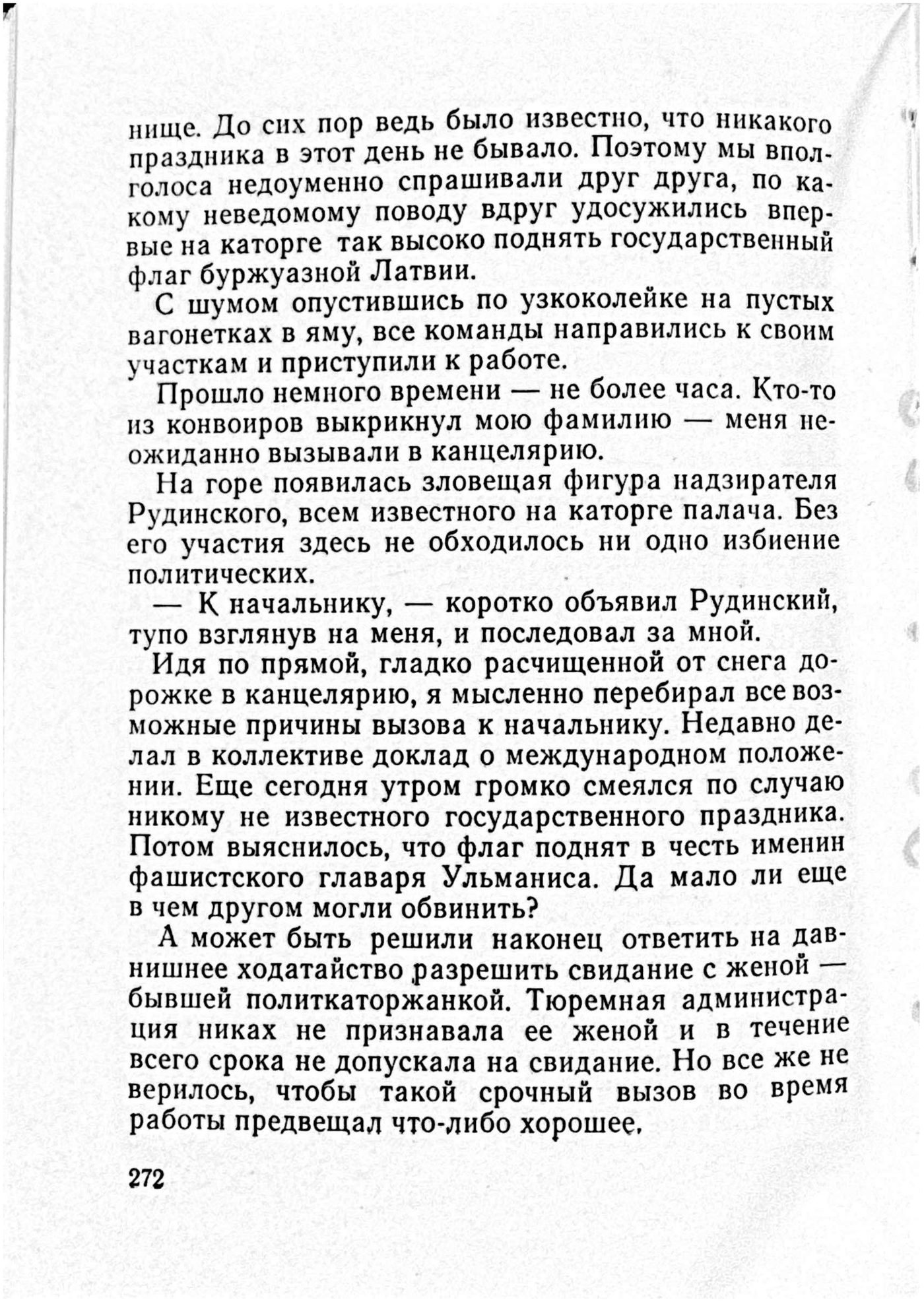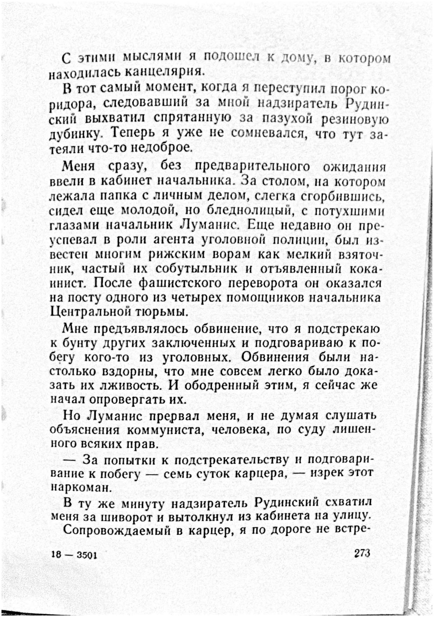 | s009_p012 | girsh 9 of x.pdf | 12 | preview | ocr | local | not_flagged | С этими мыслями я подошел к дому, в котором находилась канцелярия. В тот самый момент, когда я переступил порог ко- ридора, следовавший за мной надзиратель Рудин- ский выхватил спрятанную за пазухой резиновую дубинку. Те |