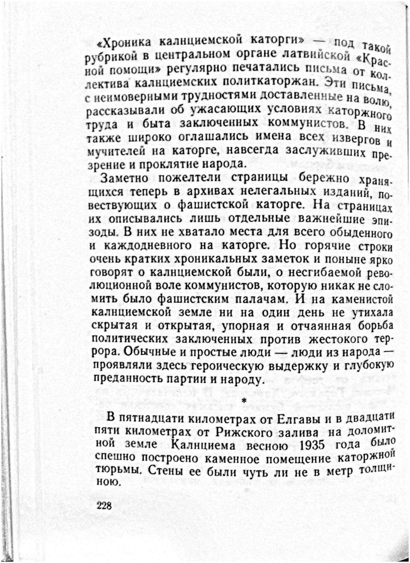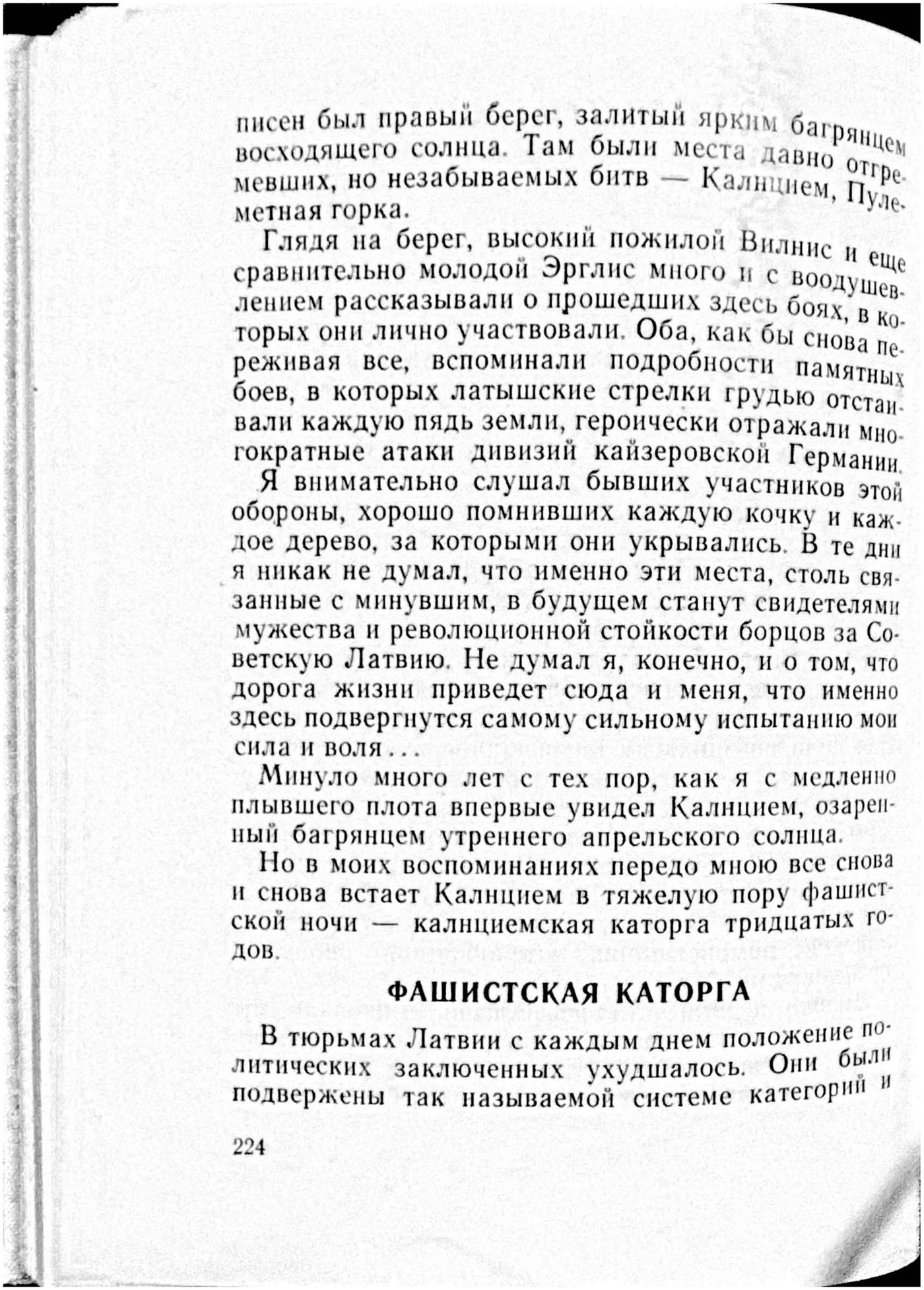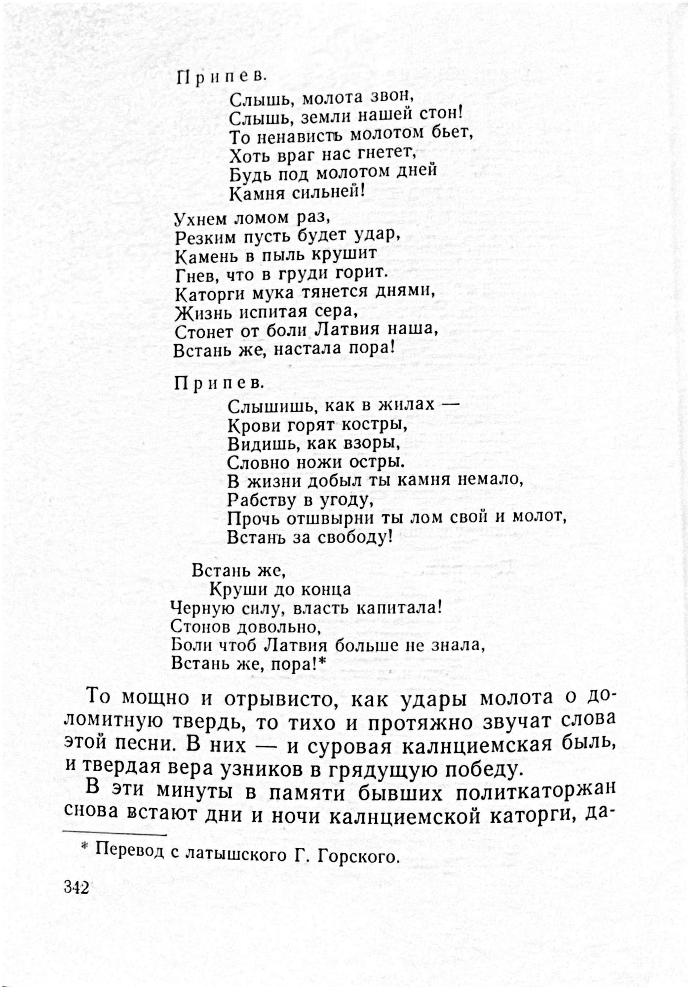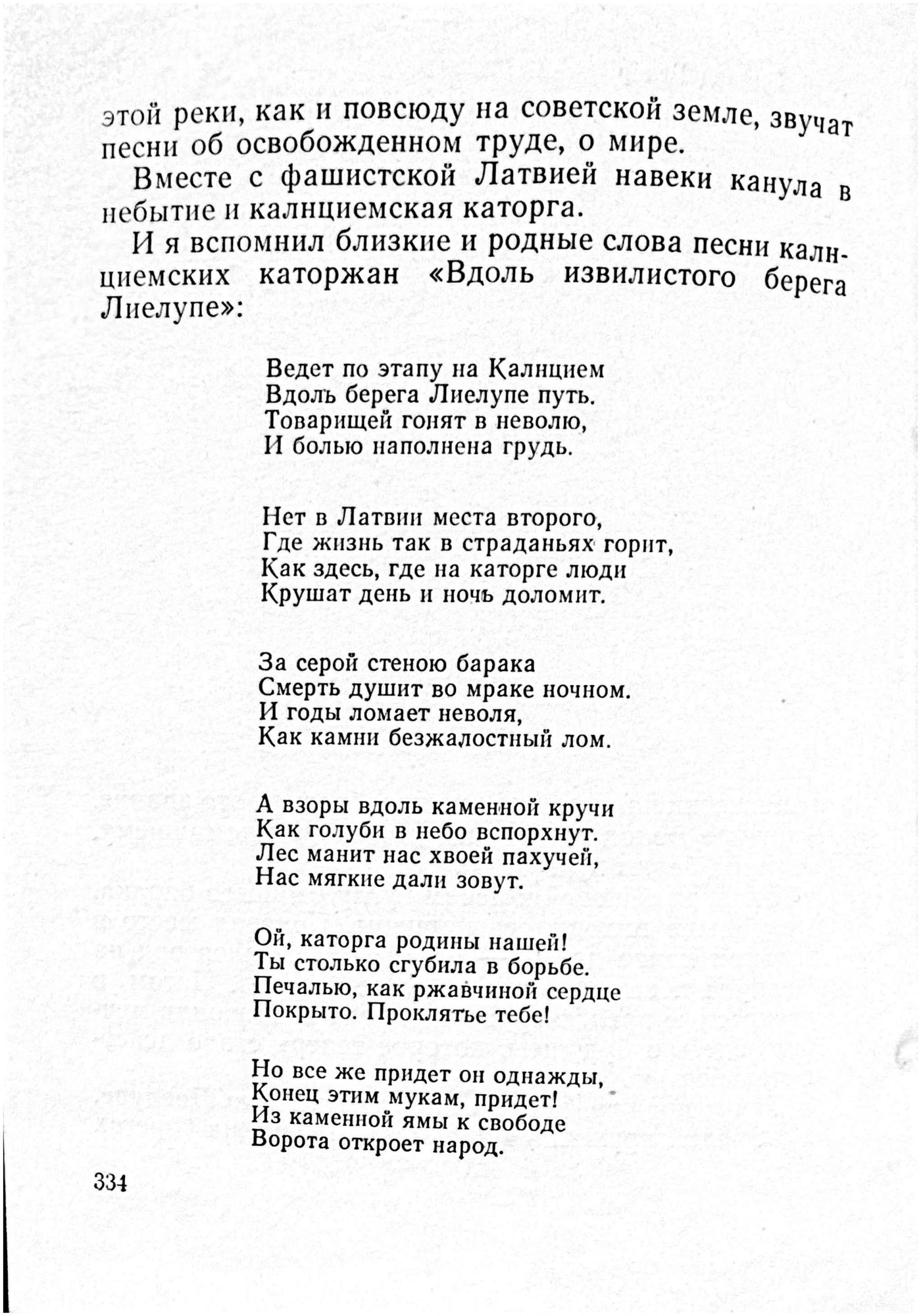 | s010_p025 | girsh 10 of x.pdf | 25 | preview | ocr | local | not_flagged | этой реки, как и повсюду на советской земле, Звучат песни об освобожденном труде, о мире. Вместе с фашистской Латвией навеки канула в небытие и калнциемская каторга. И я вспомнил близкие и родные слова песни калн- цием |