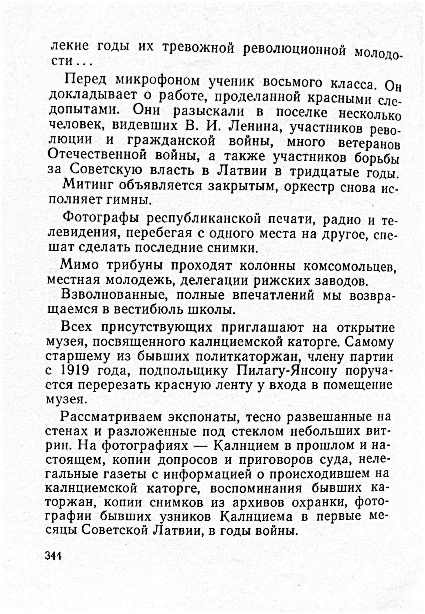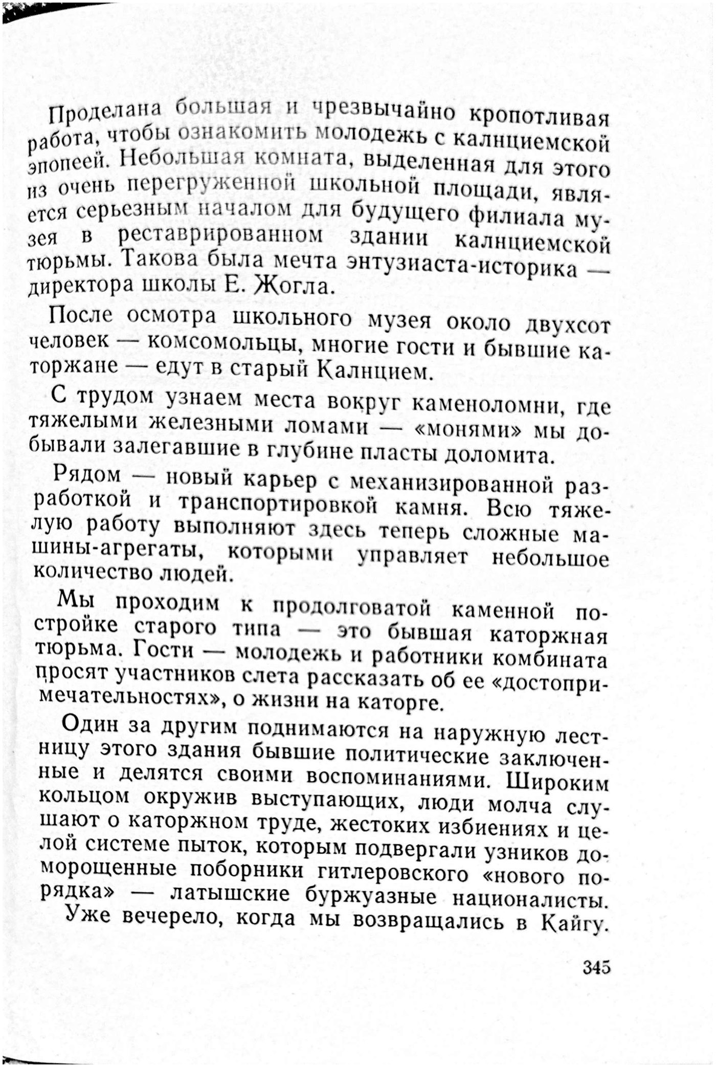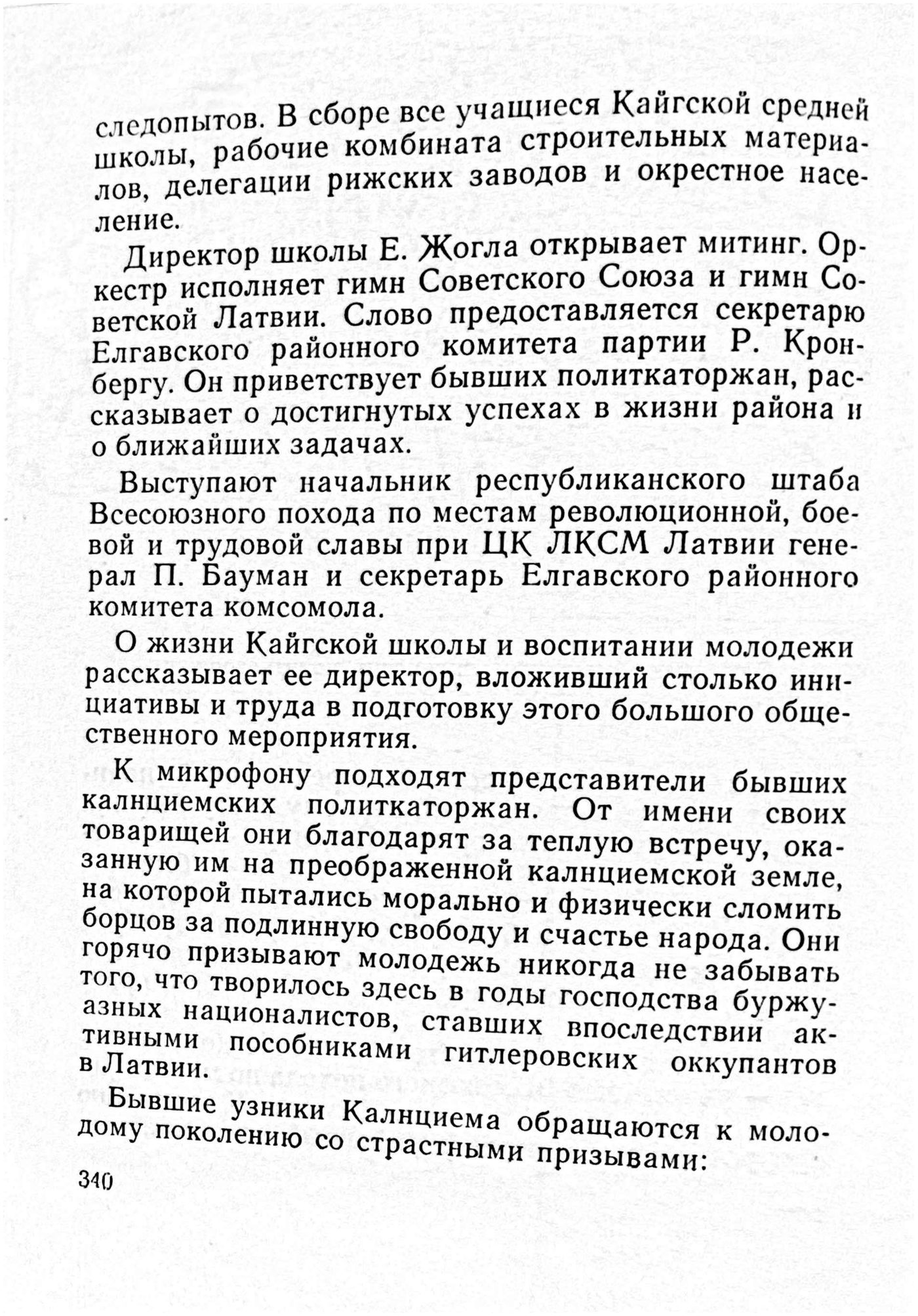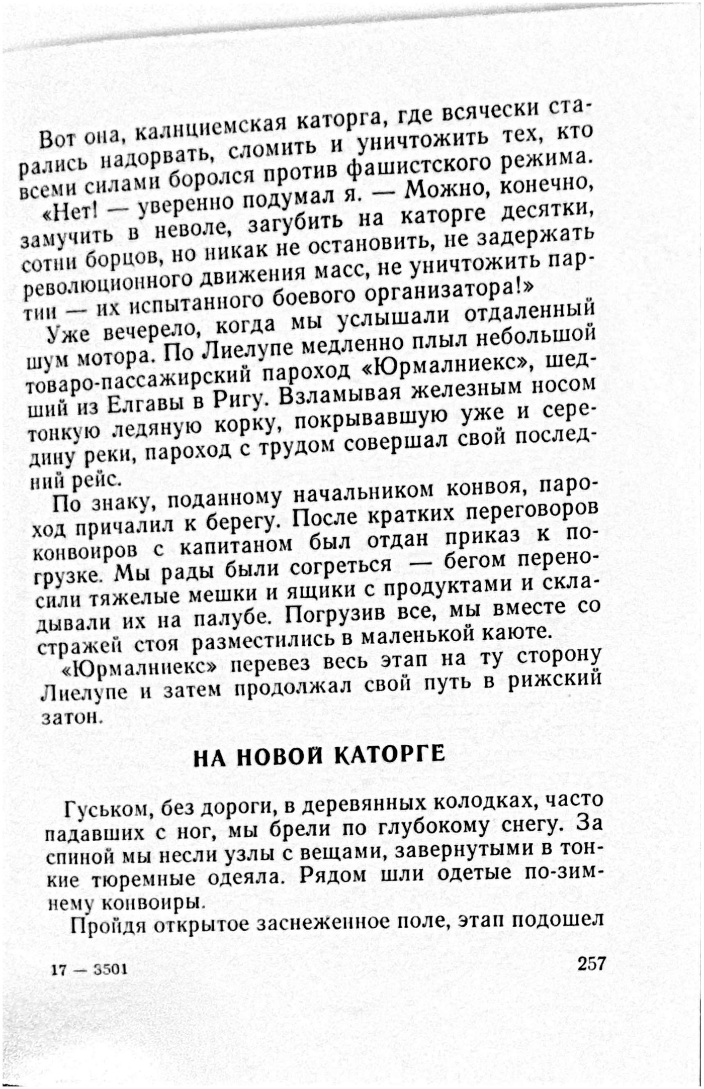 | s010_p025 | girsh 10 of x.pdf | 25 | preview | ocr | local | not_flagged | этой реки, как и повсюду на советской земле, Звучат песни об освобожденном труде, о мире. Вместе с фашистской Латвией навеки канула в небытие и калнциемская каторга. И я вспомнил близкие и родные слова песни калн- цием |