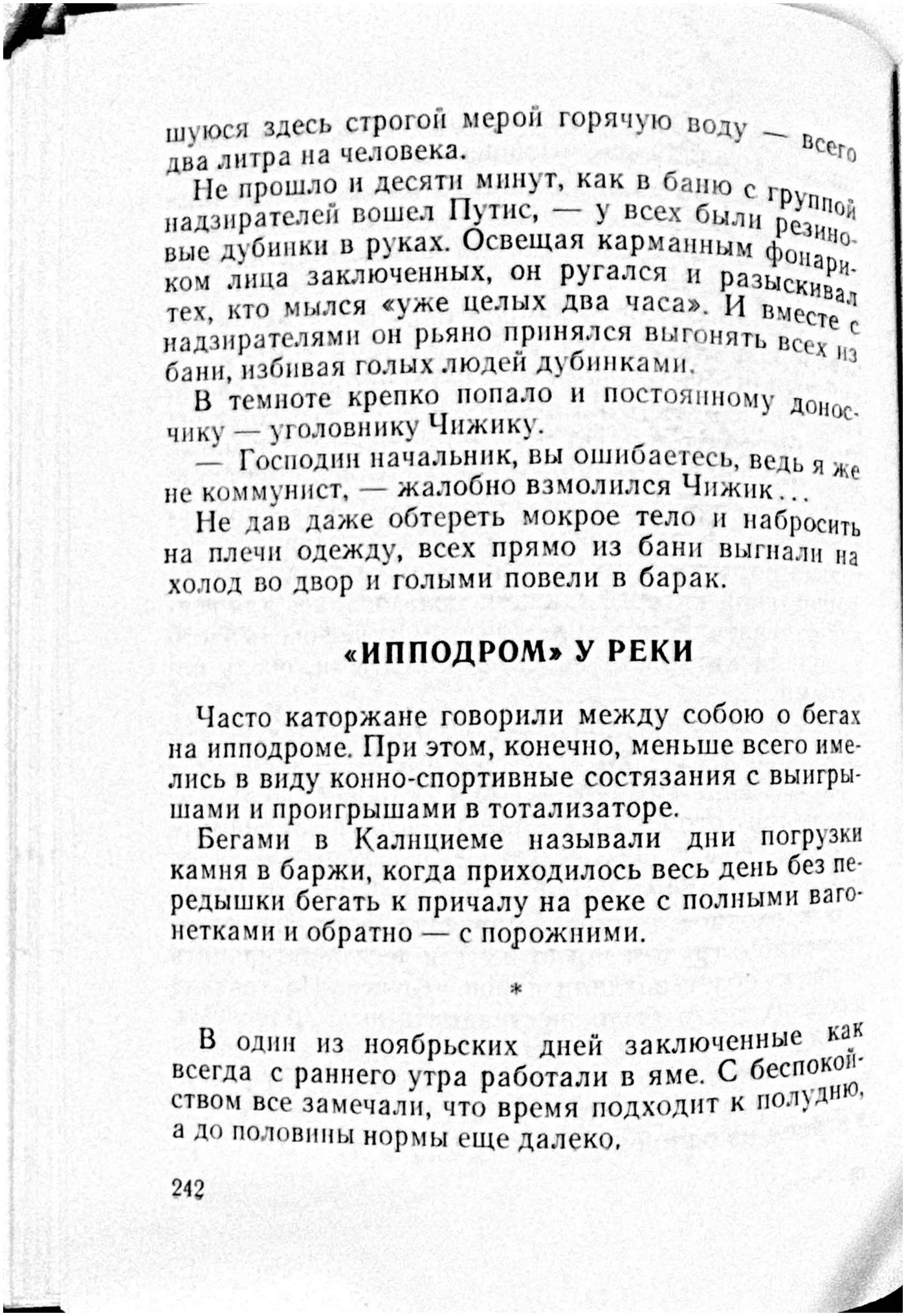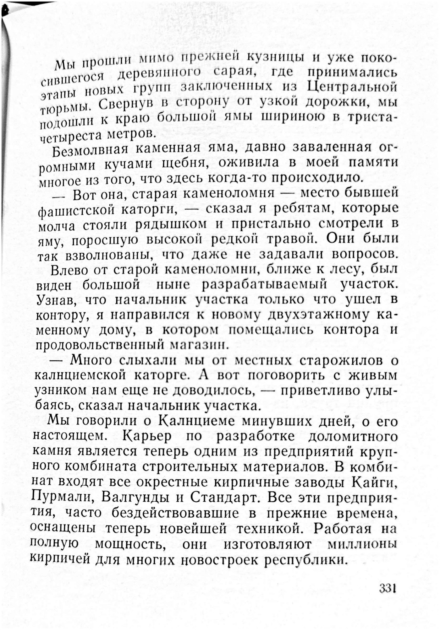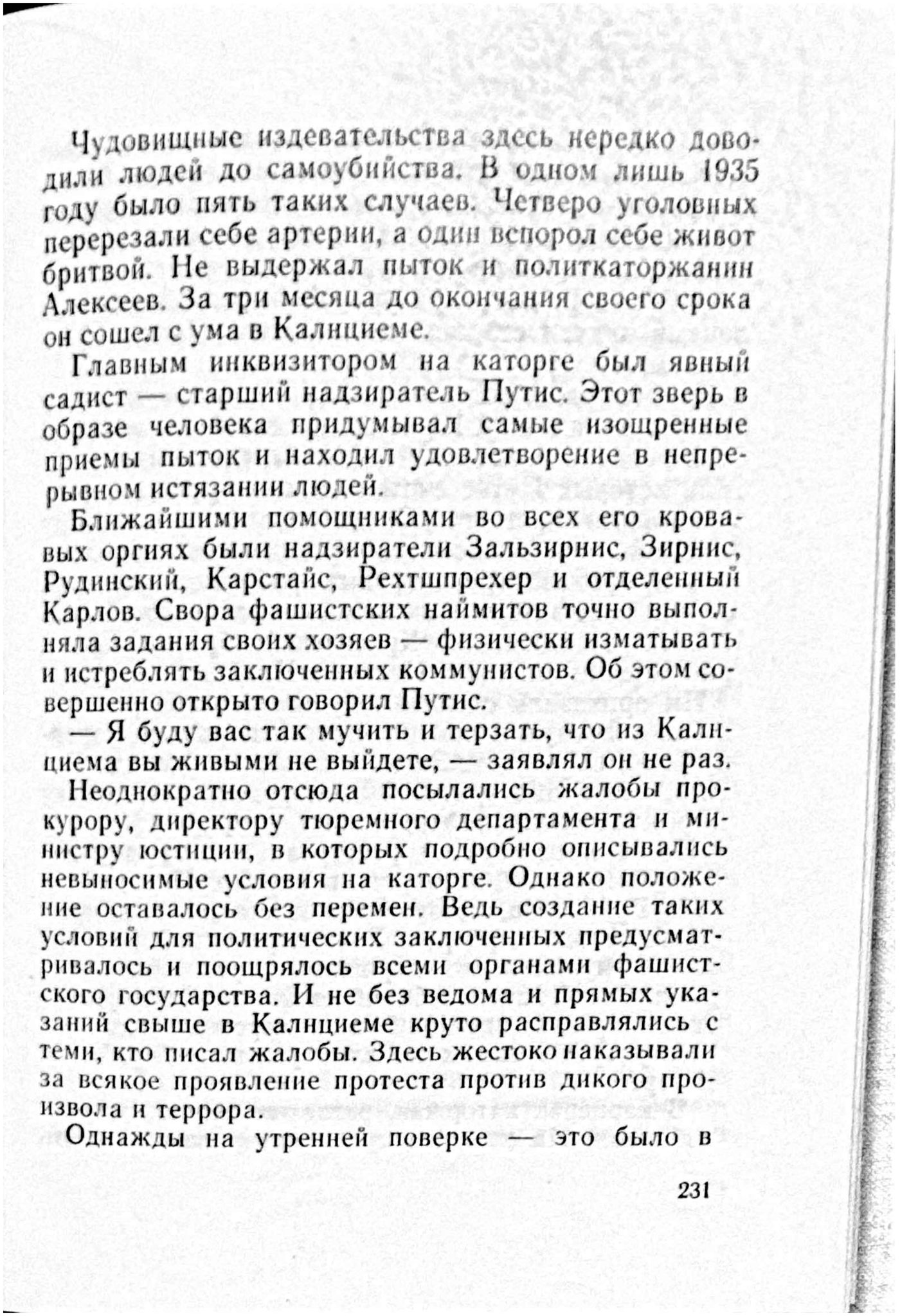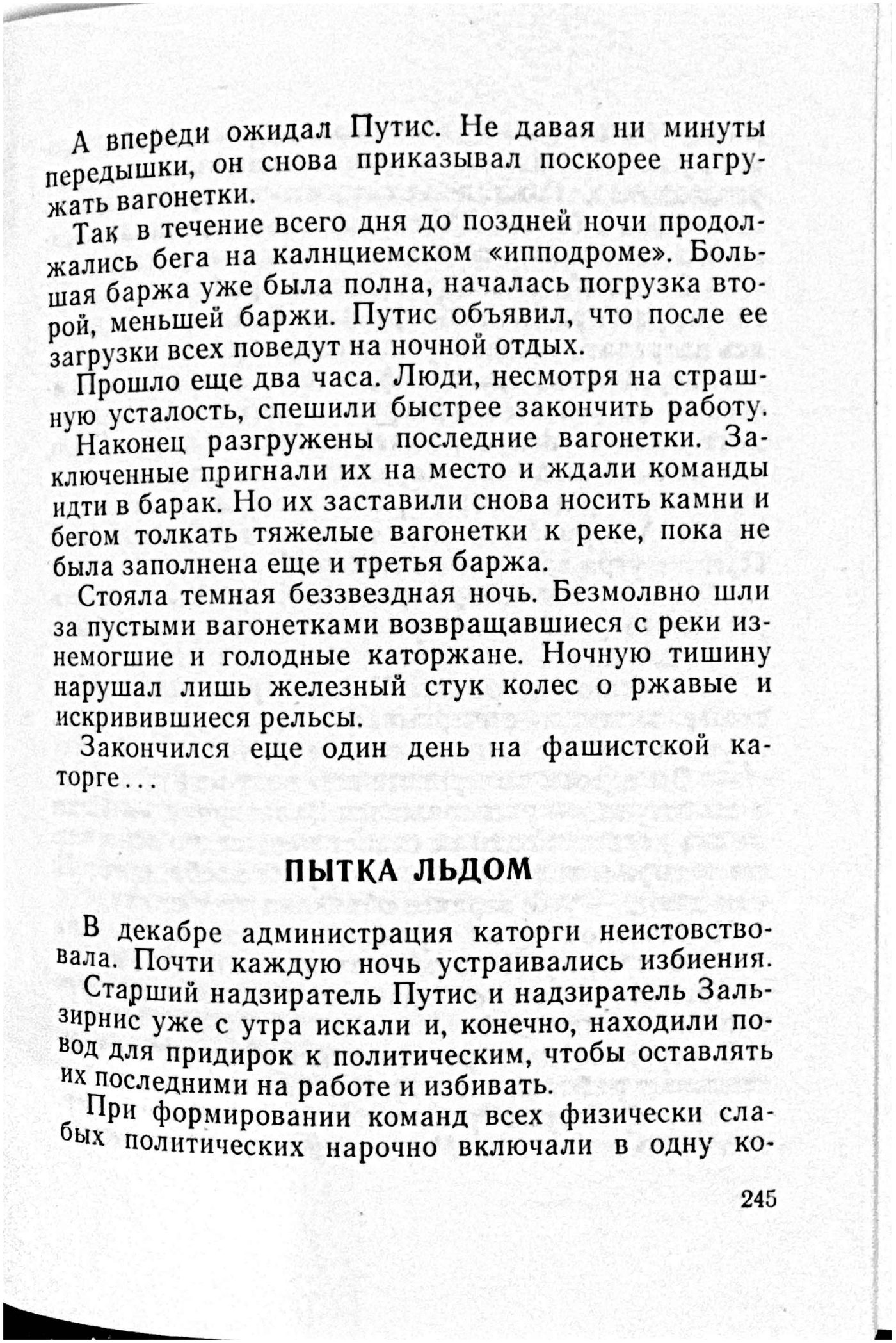 | s008_p034 | girsh 8 of x.pdf | 34 | preview | ocr | local | not_flagged | Вот она, калнциемская каторга, где всячески и рались надорвать, сломить и уничтожить тех, кт всеми силами боролся против фашистского режима. «Нет! — уверенно подумал я. — Можно, конечно, замучить В неволе, загубить на к |
