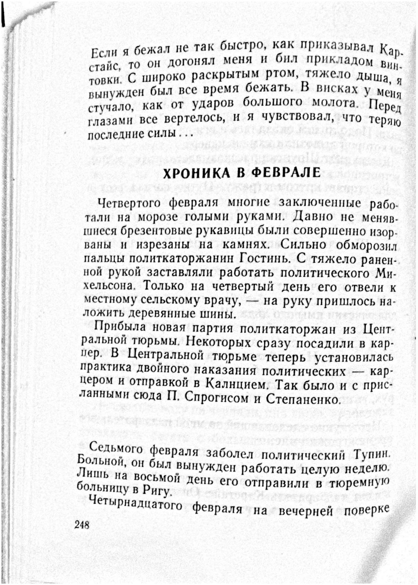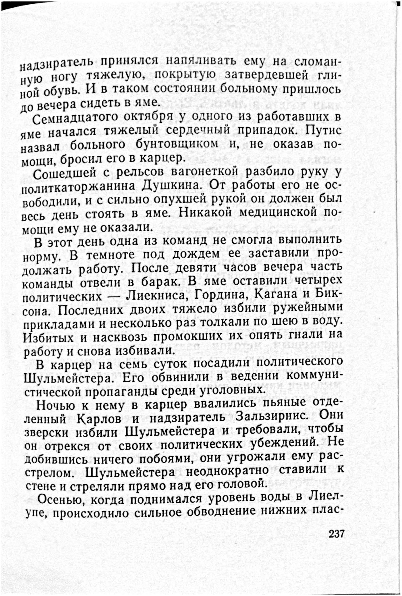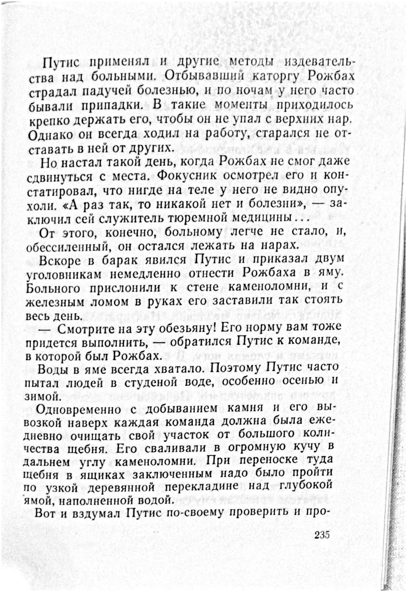| s008_p026 | girsh 8 of x.pdf | 26 | preview | ocr | local | not_flagged | старший надзиратель Путис кулаками бил заклю- ченного, ставшего в шеренге не на свое место. Пятнадцатого февраля заболел политический Фридрихсон. В тяжелом состоянии, с высокой тем- пературой его заставили работать в ям |