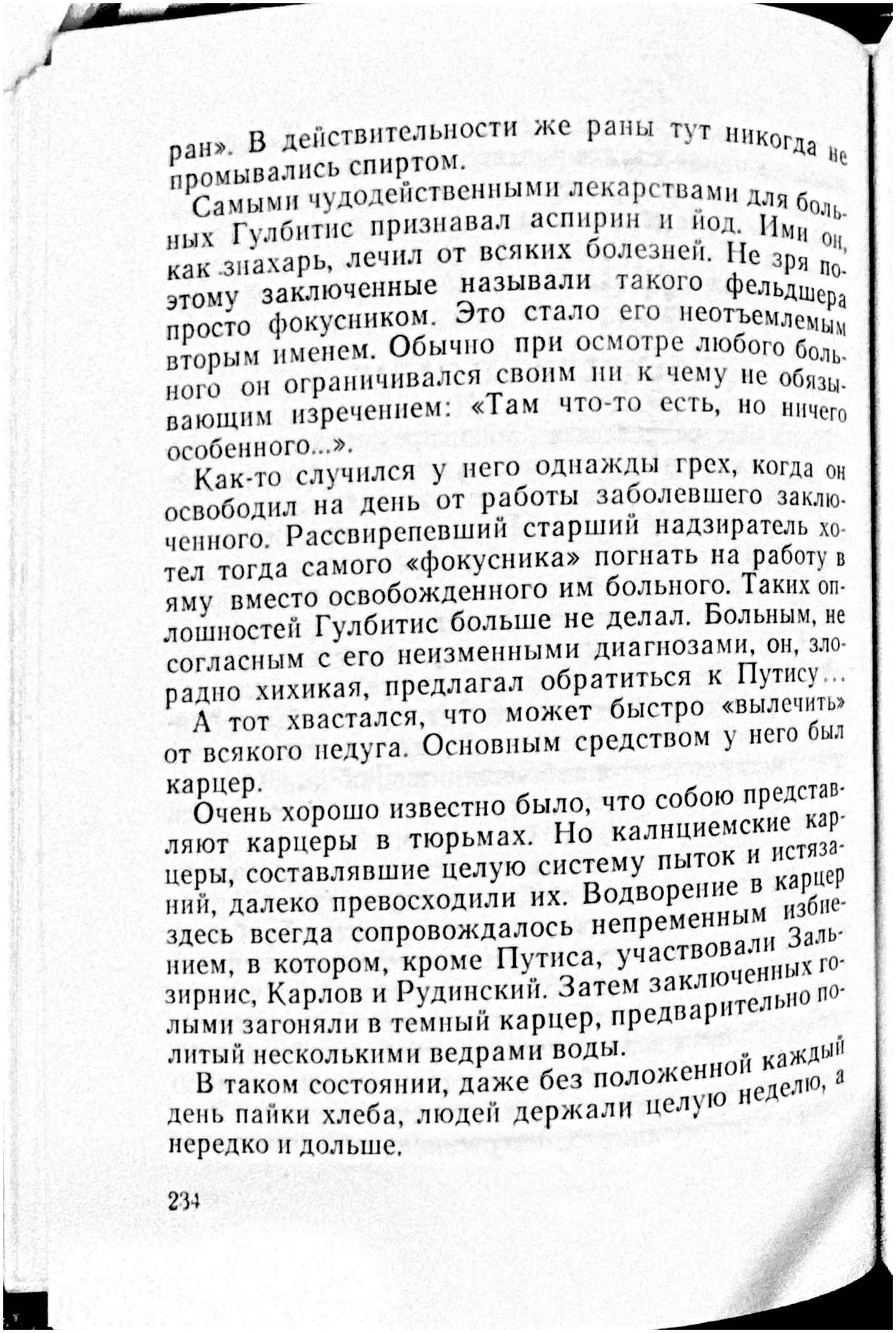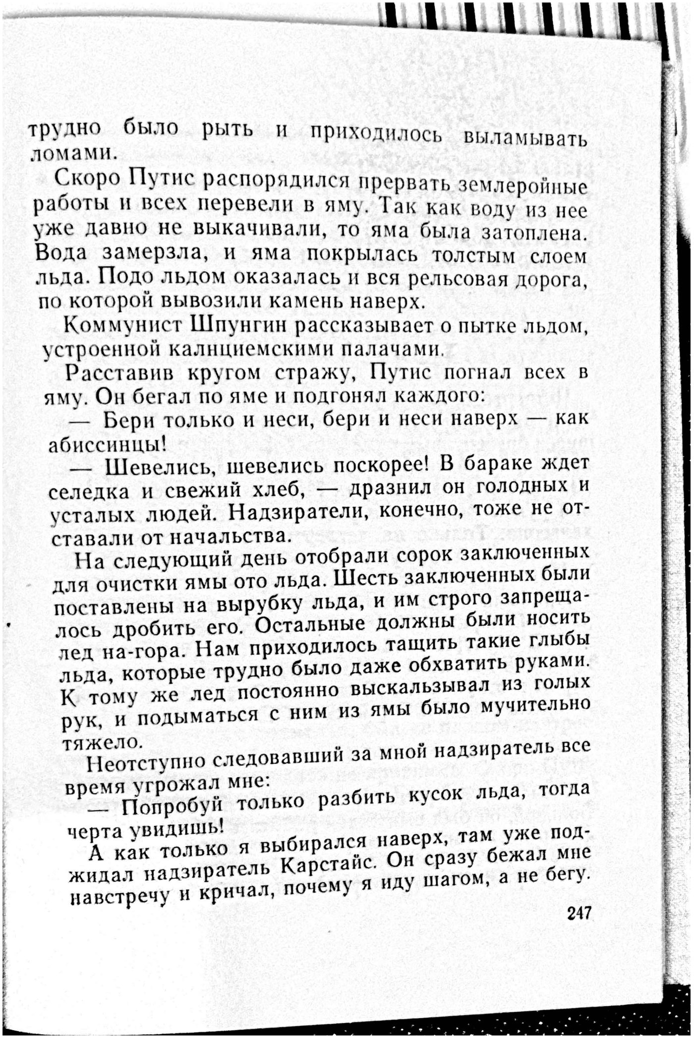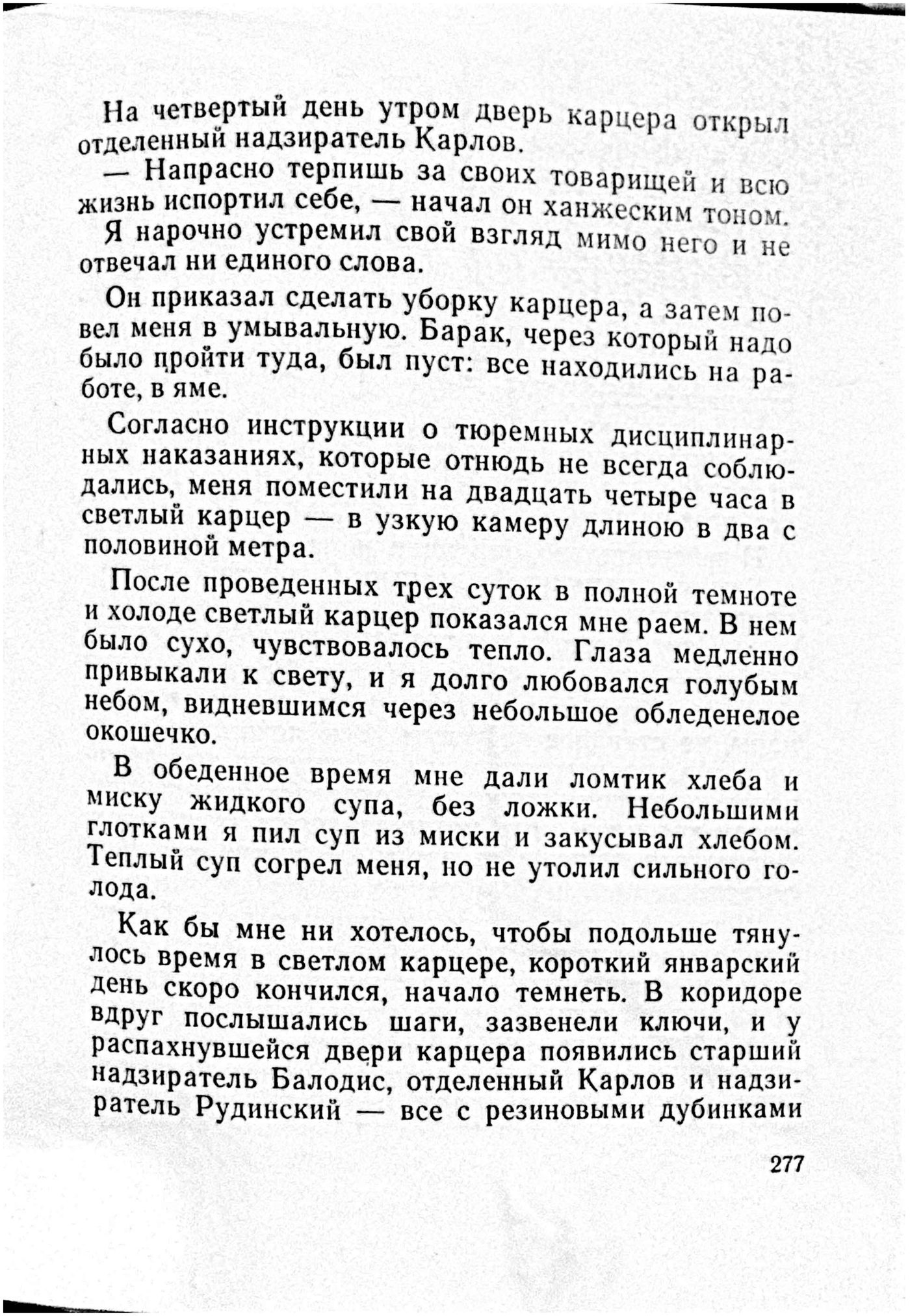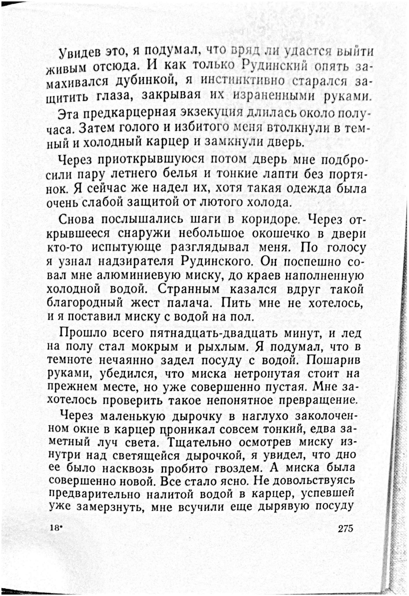 | s009_p015 | girsh 9 of x.pdf | 15 | preview | ocr | local | not_flagged | —эЭ5=5=щщ с водой, чтобы увлажнить лед и причинить побольше мучений. Томительно тянулись часы в карцере. Ходить по мокрому полу в лаптях нельзя было, и я стоя при- слонился к стене, Нащупав вдоль левой стены пару мокры |