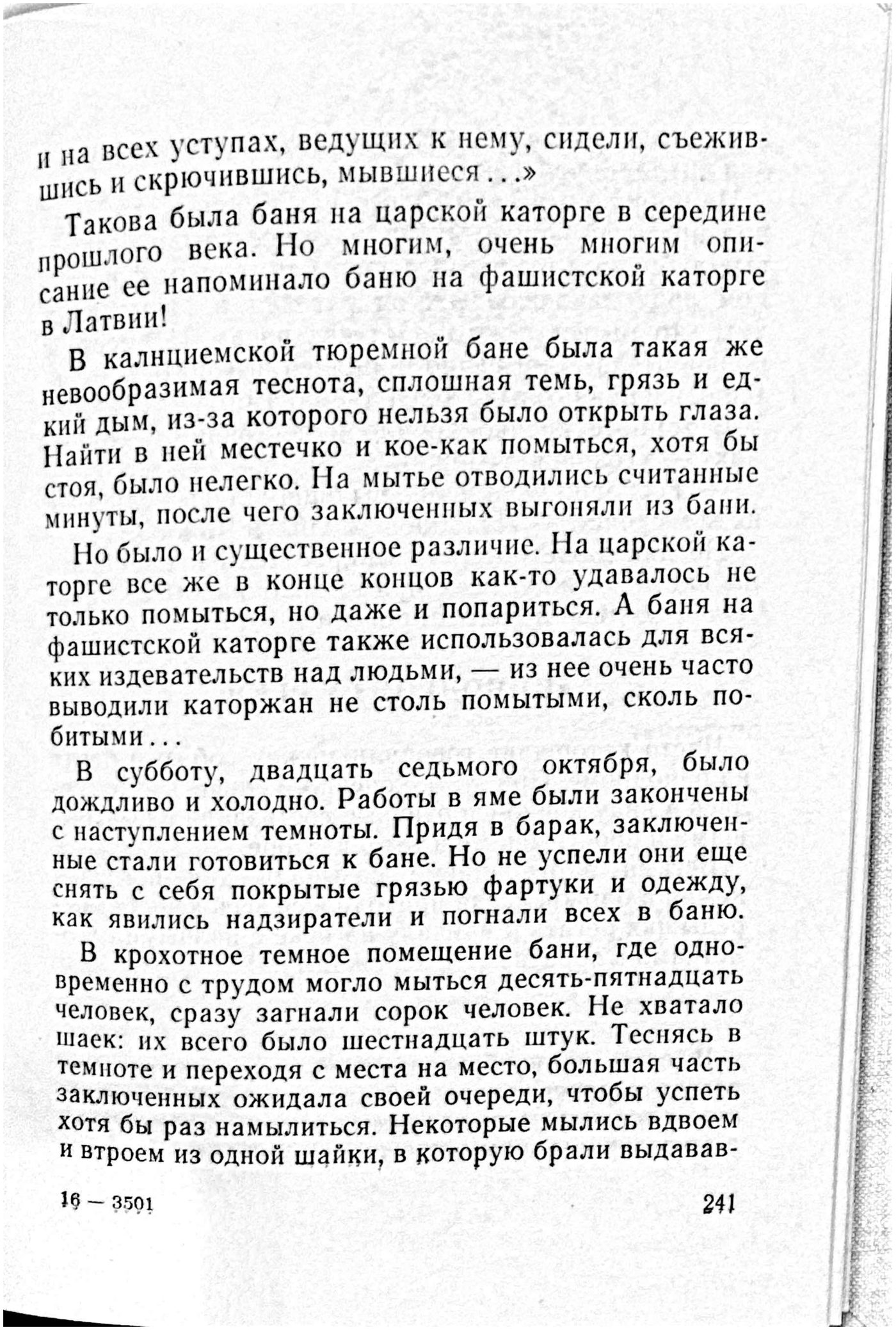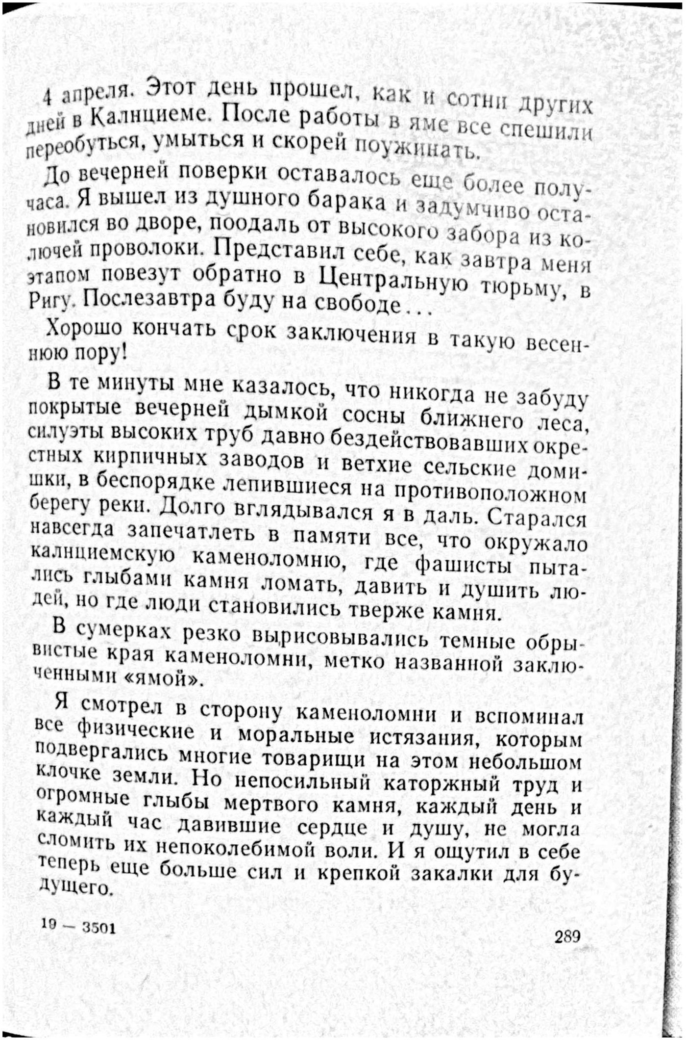 | s009_p028 | girsh 9 of x.pdf | 28 | preview | ocr | local | not_flagged | —ыэы5 > { апреля. Этот день прошел, как и сотни других яв Калнциеме. После работы В яме все спешили переобуться, умыться и скорей поужинать. Е До вечерней поверки оставалось еще более полу- часа. Я вышел из душного барак |