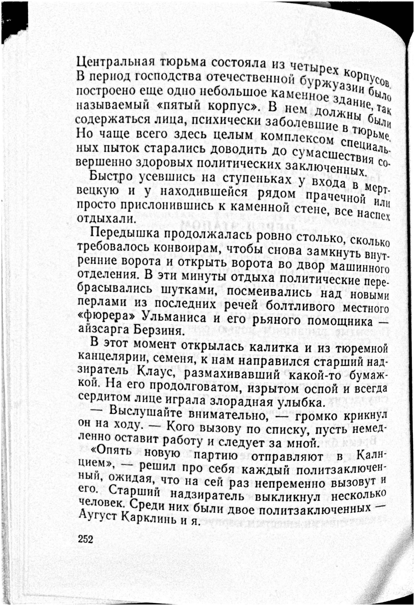 | s008_p030 | girsh 8 of x.pdf | 30 | preview | ocr | local | not_flagged | — Здоров? — быстро спрашивал он каждого. Я и Карклинь ответили утвердительно. В таких случаях ссылаться на болезнь было бесполезно. Каждый знал, что тюремная администрация пользовалась от- правкой в Калнцием как специаль |