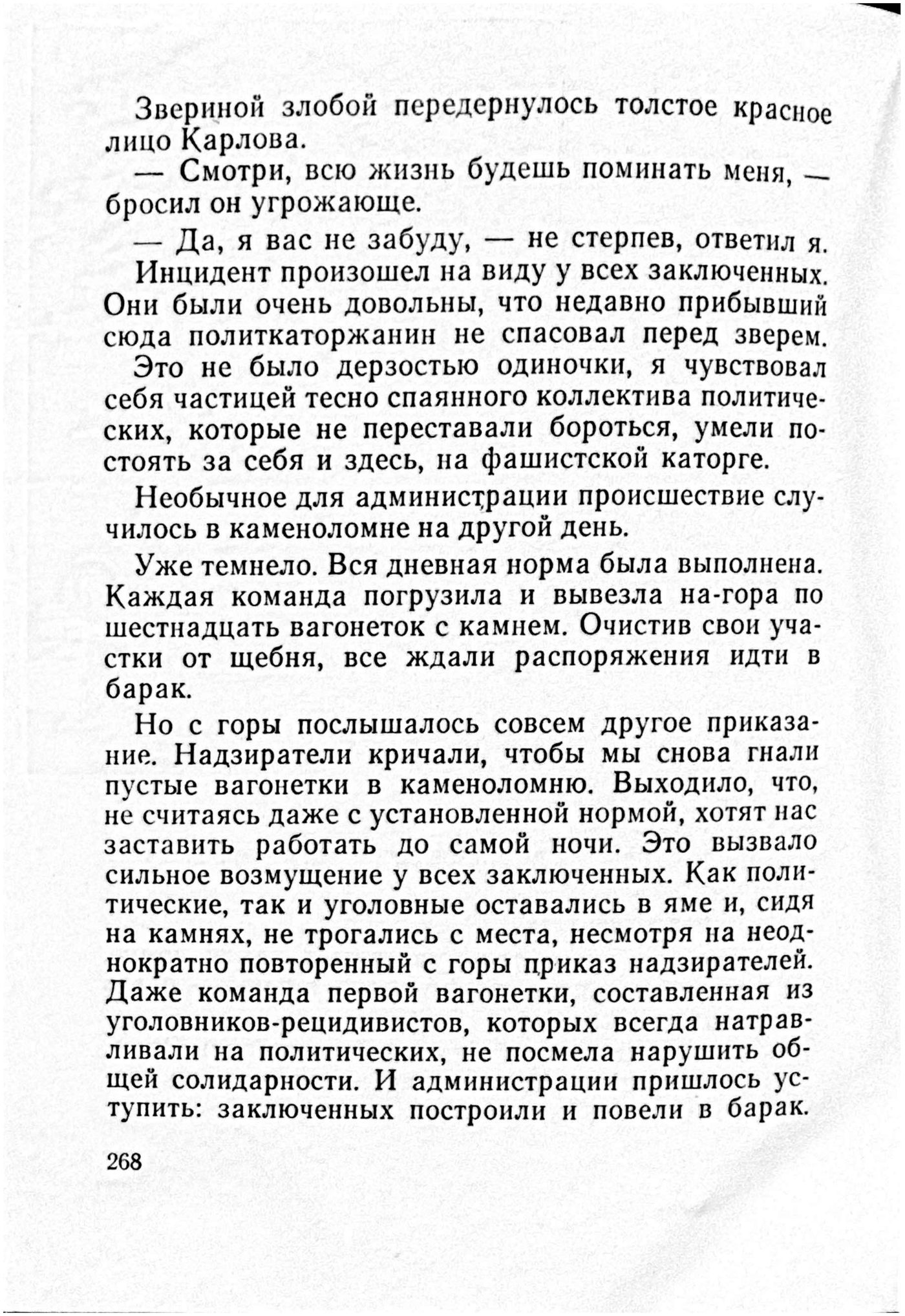 | s009_p013 | girsh 9 of x.pdf | 13 | preview | ocr | local | not_flagged | 3 г тил ни одного из заключенных. Никто из них не ув: дел и не узнал, что меня уводят в карцер. Все НЯ заранее подготовлено так, чтобы товарищи осталис, в полном неведении о происходящем. В Тот день вы. гнали из барака н |