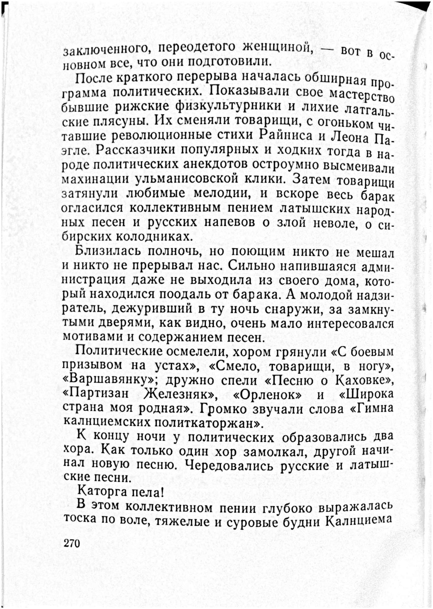 | s009_p009 | girsh 9 of x.pdf | 9 | preview | ocr | local | not_flagged | Г РИ заключенного, переодетого женщиной, — вот в ое. новном все, что они подготовили. , После краткого перерыва началась обширная про- грамма политических. Показывали свое Мастерство бывшие рижские физкультурники и лихи |