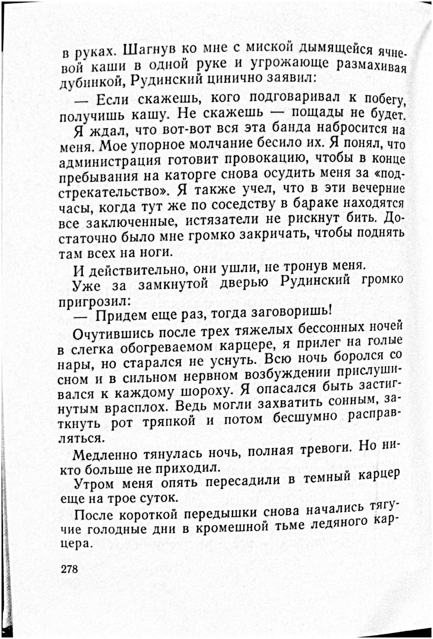 | s009_p017 | girsh 9 of x.pdf | 17 | preview | ocr | local | not_flagged | в руках. Шагнув ко мне с миской дымящейся ще вой каши в одной руке и угрожающе размахивая дубинкой, Рудинский цинично заявил: . | — Если скажешь, кого подговаривал к побегу | получишь кашу. Не скажешь — пощады не будет |