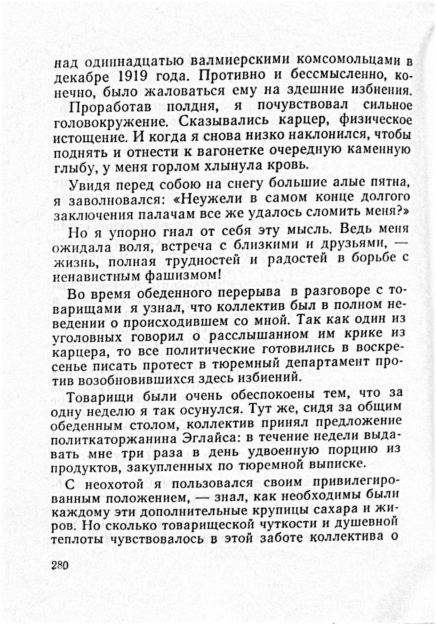 | s009_p019 | girsh 9 of x.pdf | 19 | preview | ocr | local | not_flagged | над одиннадцатью валмиерскими комсомольцами в декабре 1919 года. Противно и бессмысленно, ко- нечно, было жаловаться ему на здешние избиения. Проработав полдня, я почувствовал сильное головокружение. Сказывались карцер, |