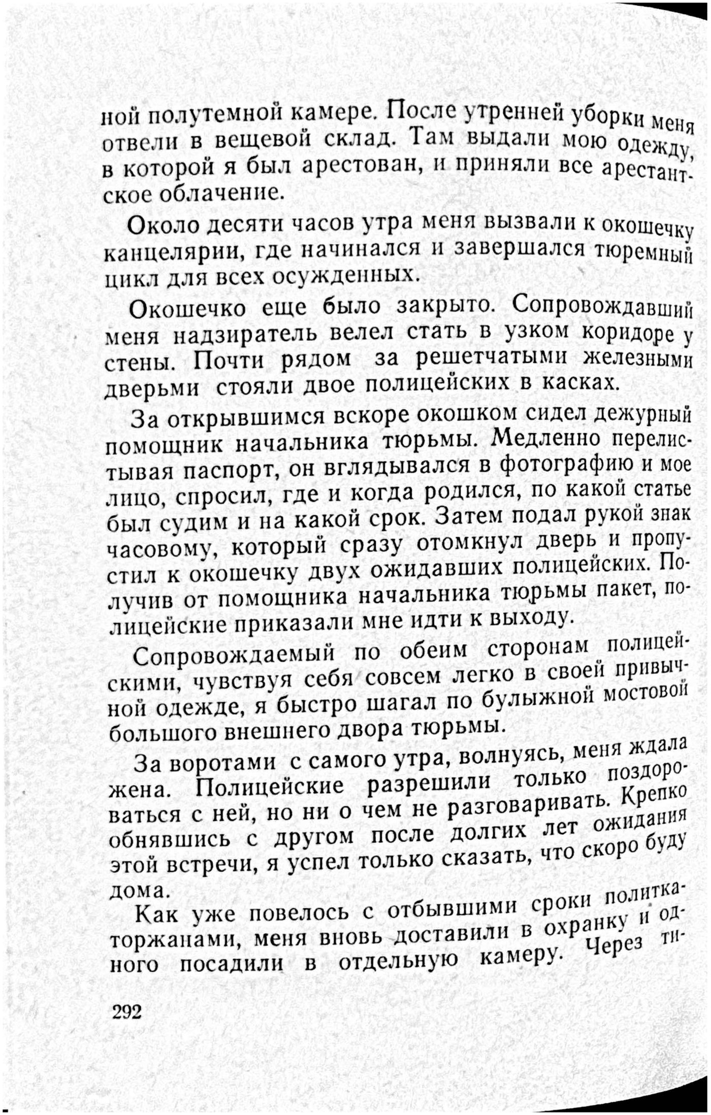 | s009_p031 | girsh 9 of x.pdf | 31 | preview | ocr | local | not_flagged | м ной полутемной камере. После утренней уборки отвели в вещевой склад. Там выдали мою рн в которой я был арестован, и приняли все арес ду, ское облачение. “ант. Около десяти часов утра меня вызвали к окошечку канцелярии |
