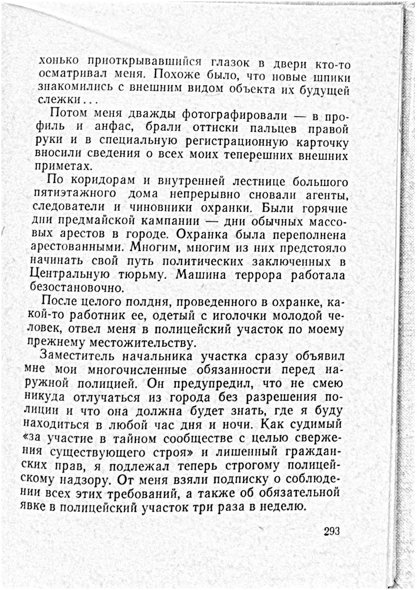 | s009_p032 | girsh 9 of x.pdf | 32 | preview | ocr | local | not_flagged | хонько приоткрывавшийся глазок в двери кто-то осматривал меня. Похоже было, что новые ШПИКИ знакомились с внешним видом объекта их будущей слежки... : Потом меня дважды фотографировали — в про- ры филь и анфас, брали отт |