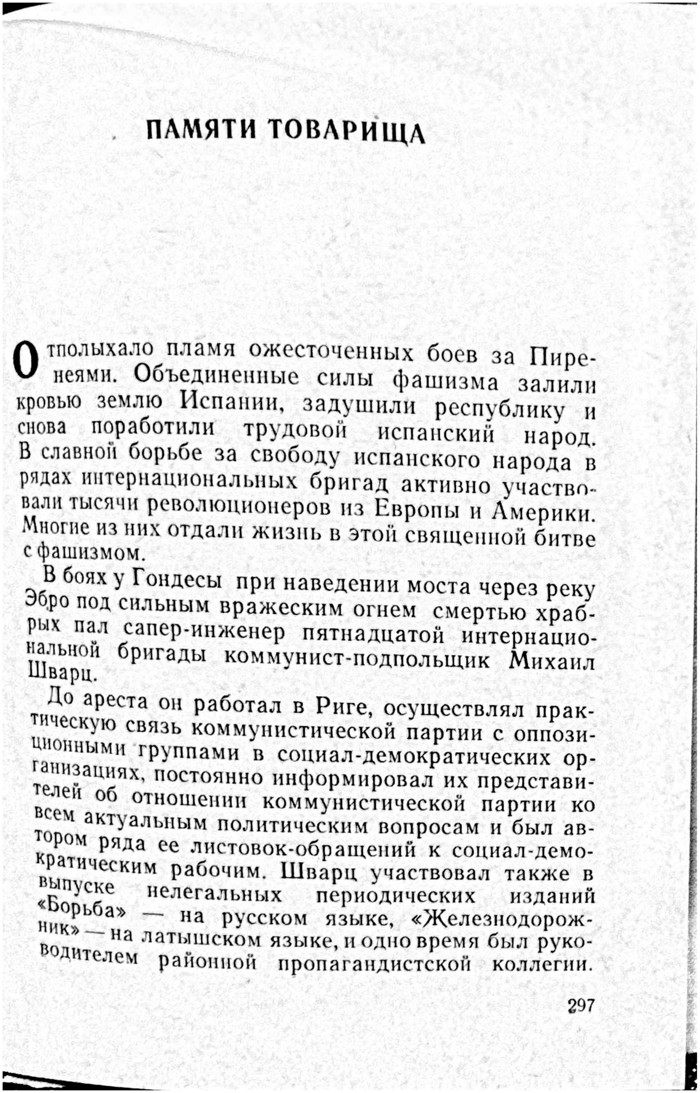 | s009_p035 | girsh 9 of x.pdf | 35 | preview | ocr | local | not_flagged | > ‚ ПАМЯТИ ТОВАРИЩА тполыхало пламя ожесточенных боев за Пире- | 0 неями. Объединенные силы фашизма залили кровью землю Испании, задушили республику и снова поработили трудовой испанский народ. В славной борьбе за свобод |