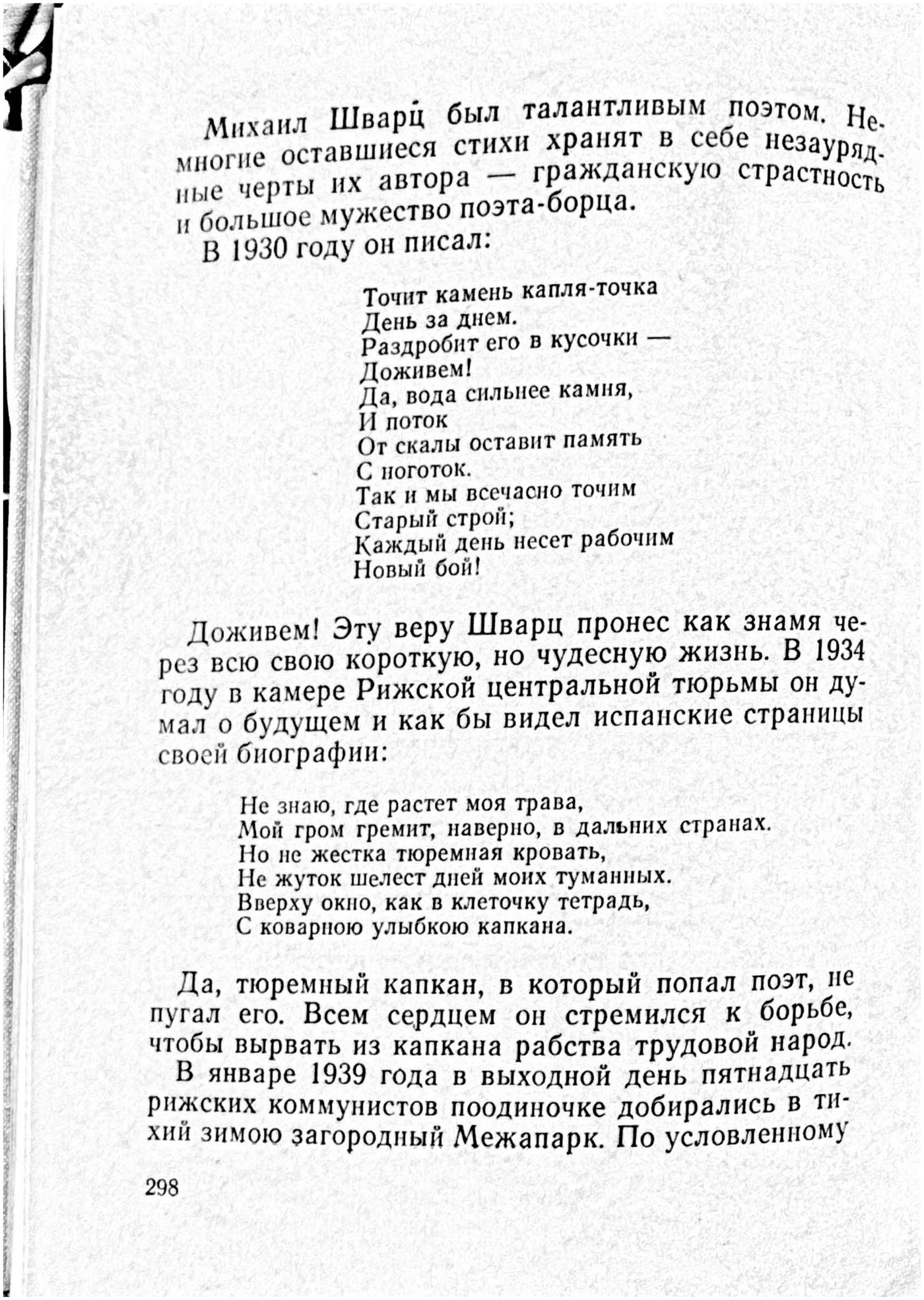 | s009_p036 | girsh 9 of x.pdf | 36 | preview | ocr | local | not_flagged | } . | Михаил Шварц был А ОМ, Не. . многие оставшиеся стихи хр Е ыы - незауряд. ные черты их автора — да нскую страстность | и большое мужество поэта-борца. | В 1930 году он писал: | Точит камень капля-точка | День за дне |