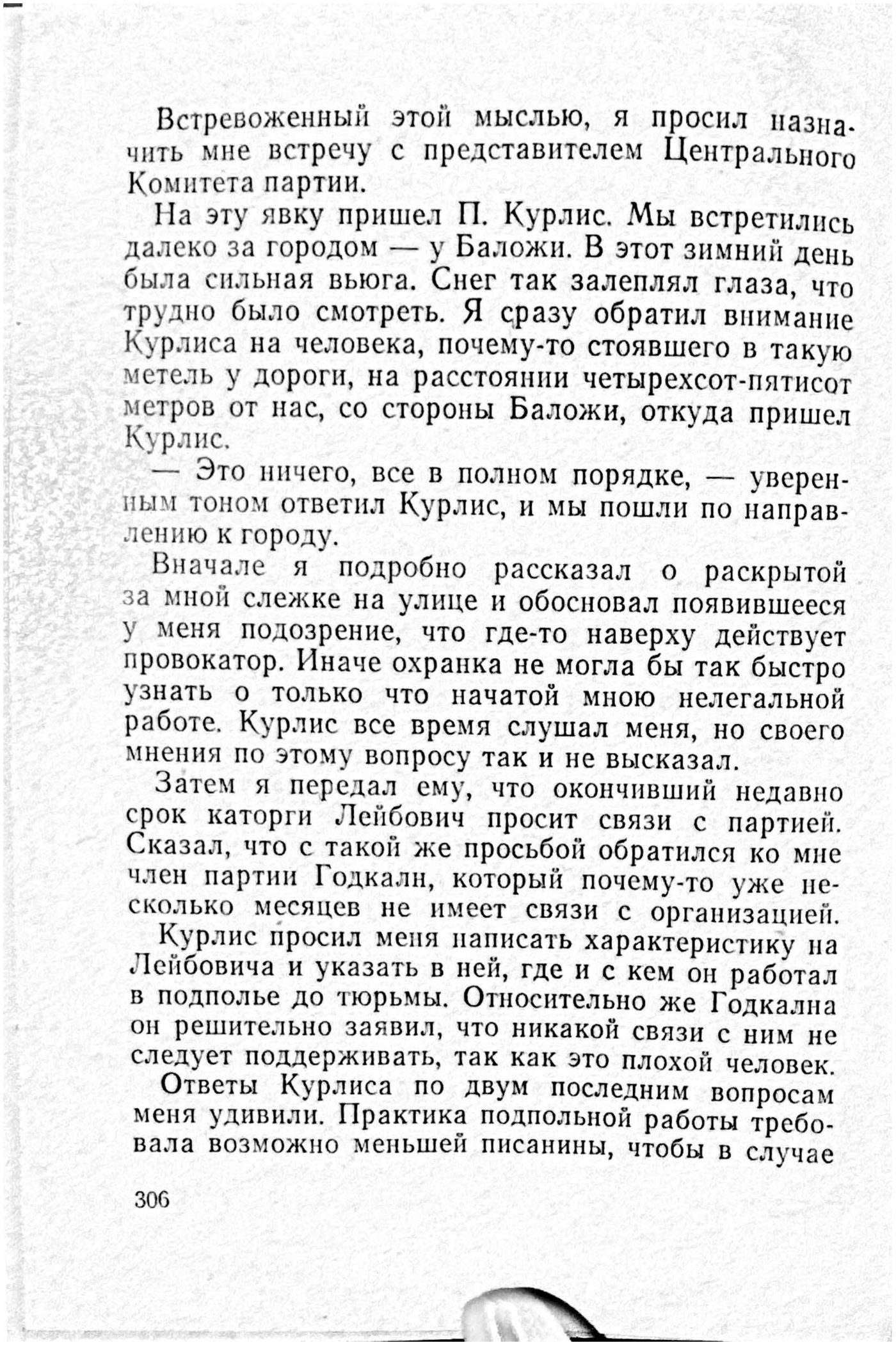 | s009_p044 | girsh 9 of x.pdf | 44 | preview | ocr | local | not_flagged | Встревоженный этой мыслью, я просил назна- чить мне встречу с представителем Центрального Комитета партии. На эту явку пришел П. Курлис. Мы встретились далеко за городом — у Баложи. В этот зимний день была сильная вьюга |