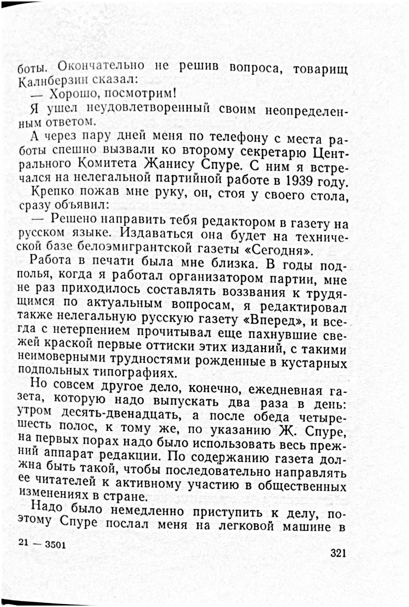 | s010_p012 | girsh 10 of x.pdf | 12 | preview | ocr | local | not_flagged | р. боты. Окончательно не решив вопроса, товарищ Калнберзин сказал: — Хорошо, посмотрим! : Я ушел неудовлетворенный своим неопределен- ным ответом. ь А через пару дней меня по телефону с места ра- боты спешно вызвали к |