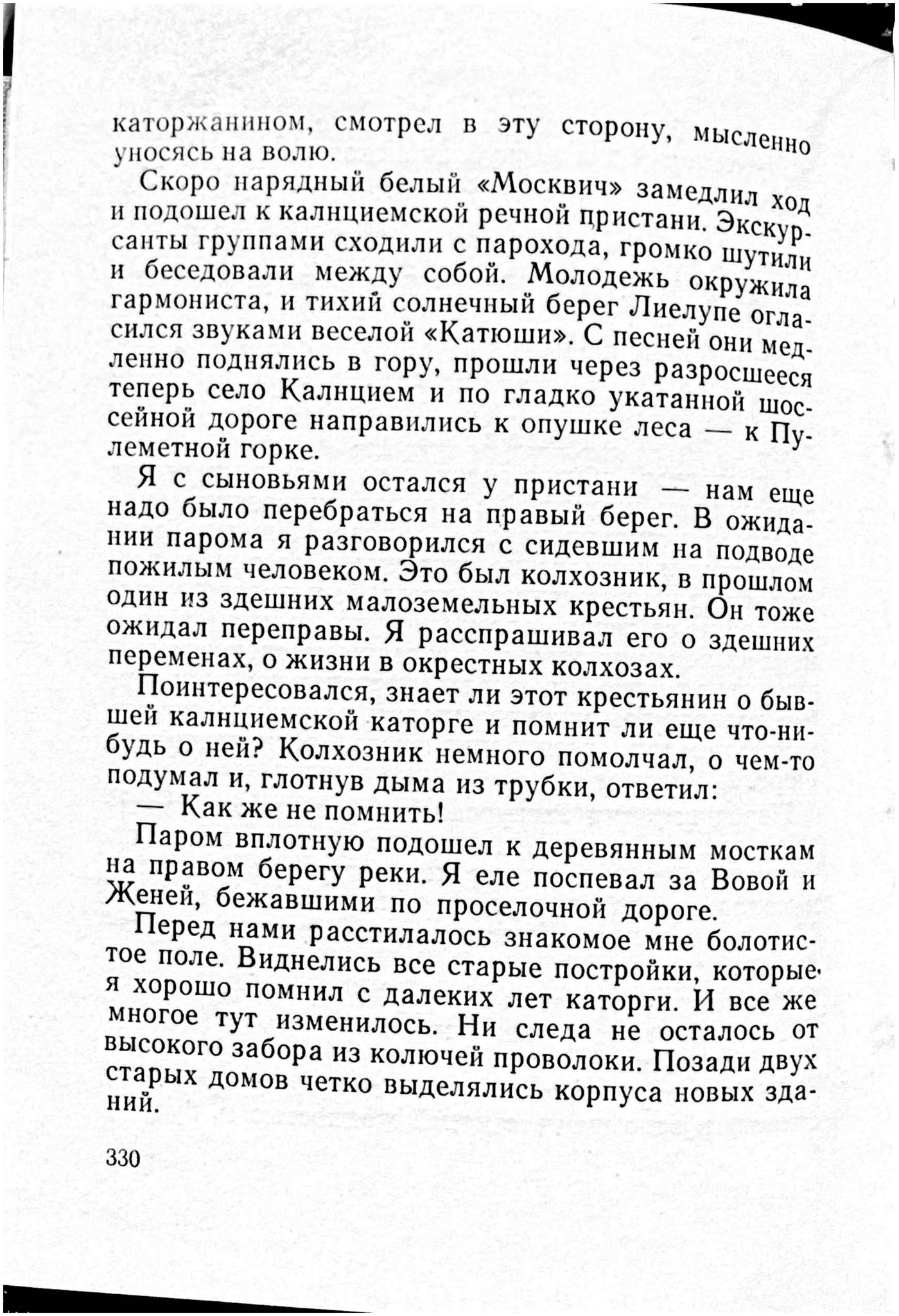 | s010_p021 | girsh 10 of x.pdf | 21 | preview | ocr | local | not_flagged | | каторжанином, смотрел в эту сторону, Мысленно | уносясь на волю. | Е | Скоро нарядный белый «Москвич» замедлил ход и подошел к калнциемской речной пристани. Экскур- санты группами сходили с парохода, громко ШУтили и |