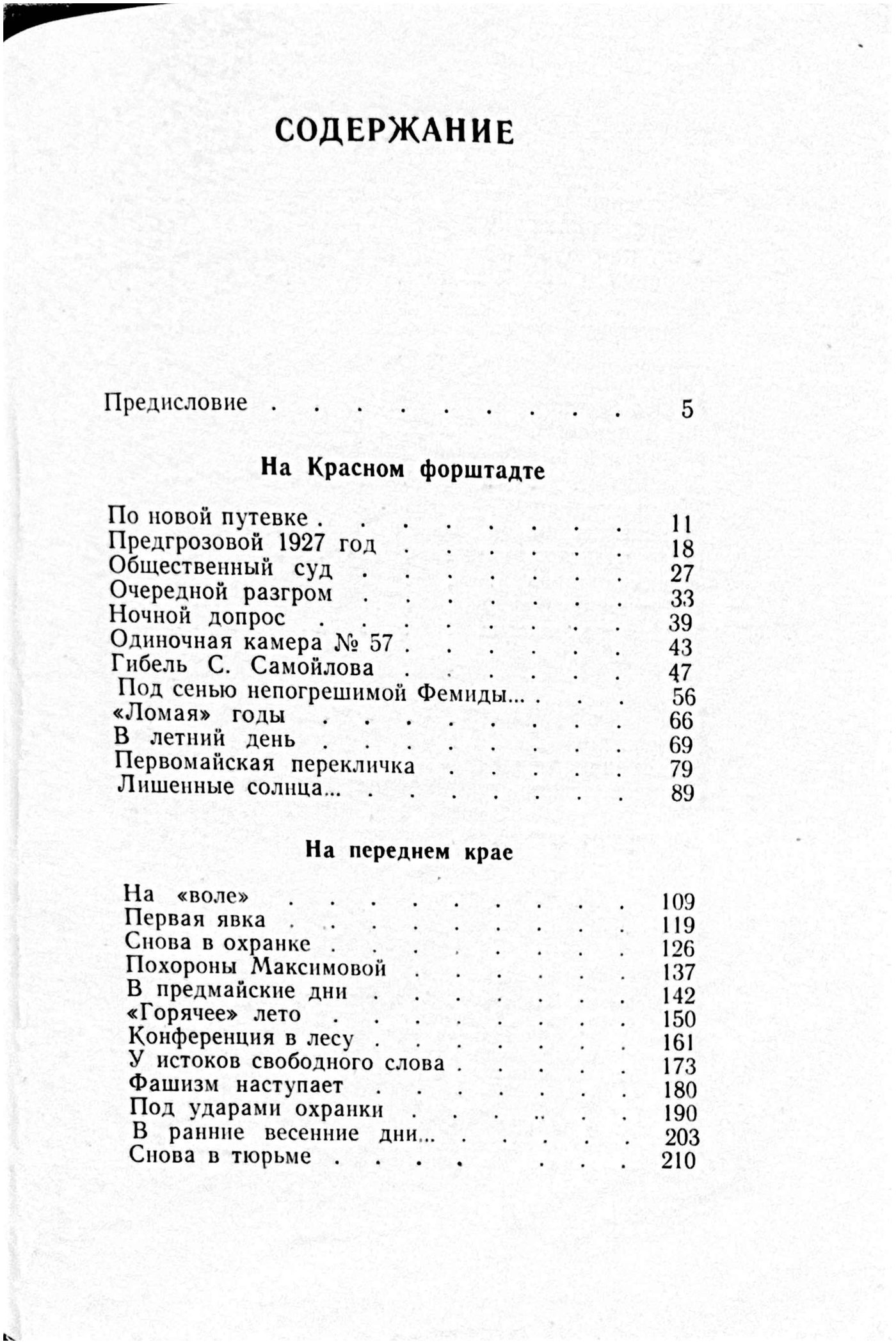 | s011_p011 | girsh 11 of 11.pdf | 11 | preview | ocr | local | not_flagged | СОДЕРЖАНИЕ Предисловие р 5 На Красном форштадте По новой путевке о. п Предгрозовой: 1927 год 18 Общественный ву 27 Очередной разгром 33 очной опров > 39 Одиночная камера № 57. . .. . 43 Гибель С. Самойлова. .. . . 47 Под |